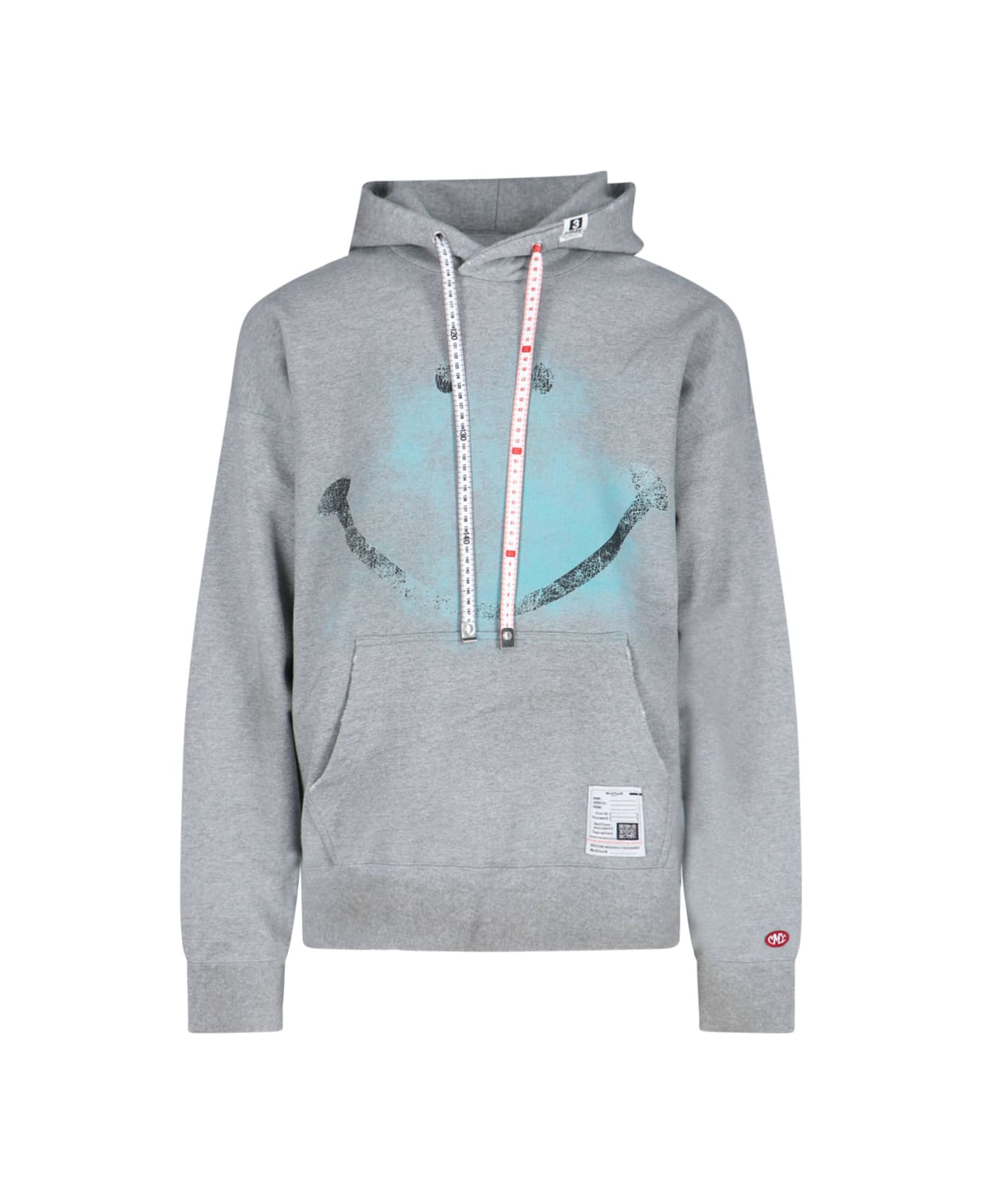 Maison Mihara Yasuhiro 'Smiley Face' hoodie in grey cotton with all-over destroyed details, drawstring hood with logo label, tailored metre-effect lace detail, multicolor maxi usured print on the front, maxi front pocket, logo label detail, logo patch on the sleeve, ribbed trims, straight hem.