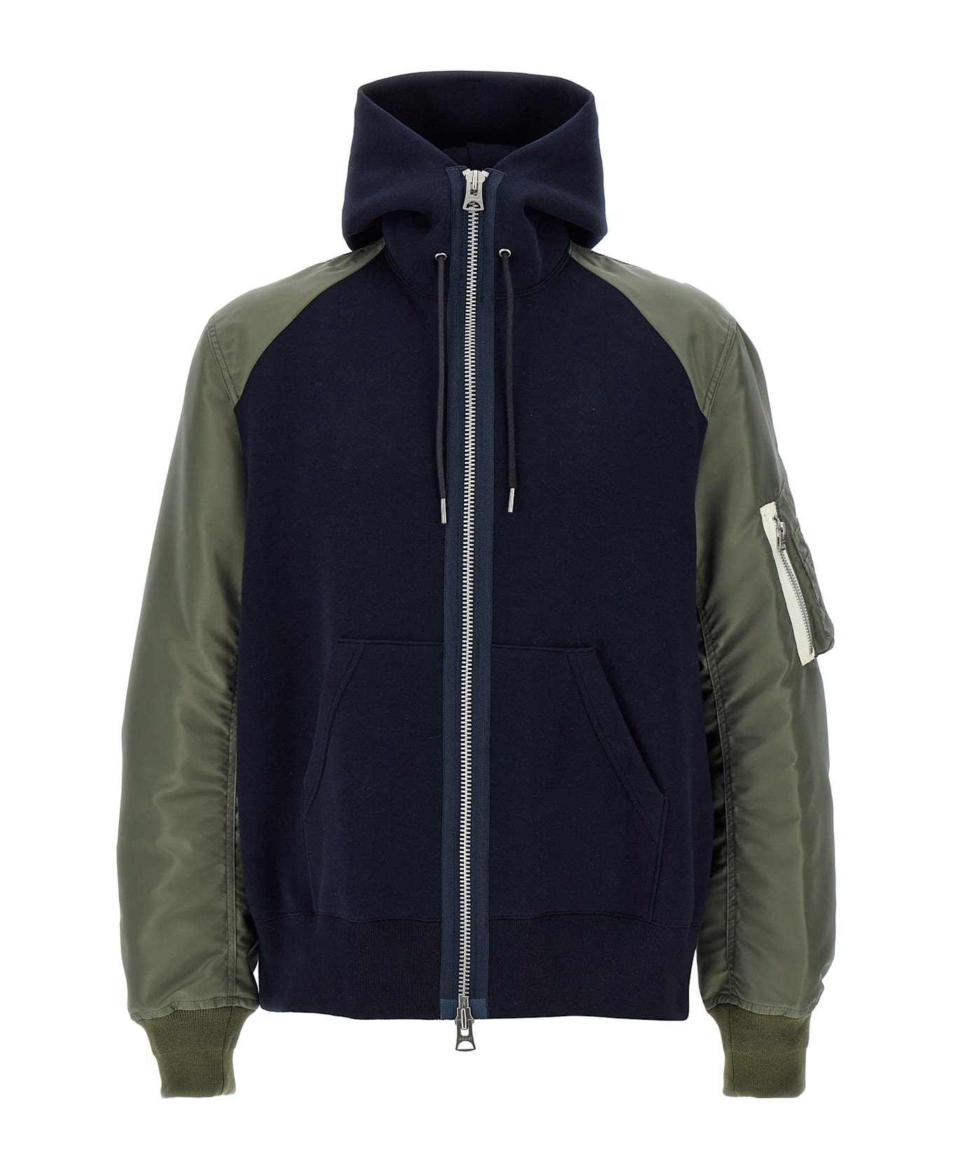 'Sponge' cotton blend hoodie with contrast nylon long sleeves with elastic cuffs, zip closure, pockets.