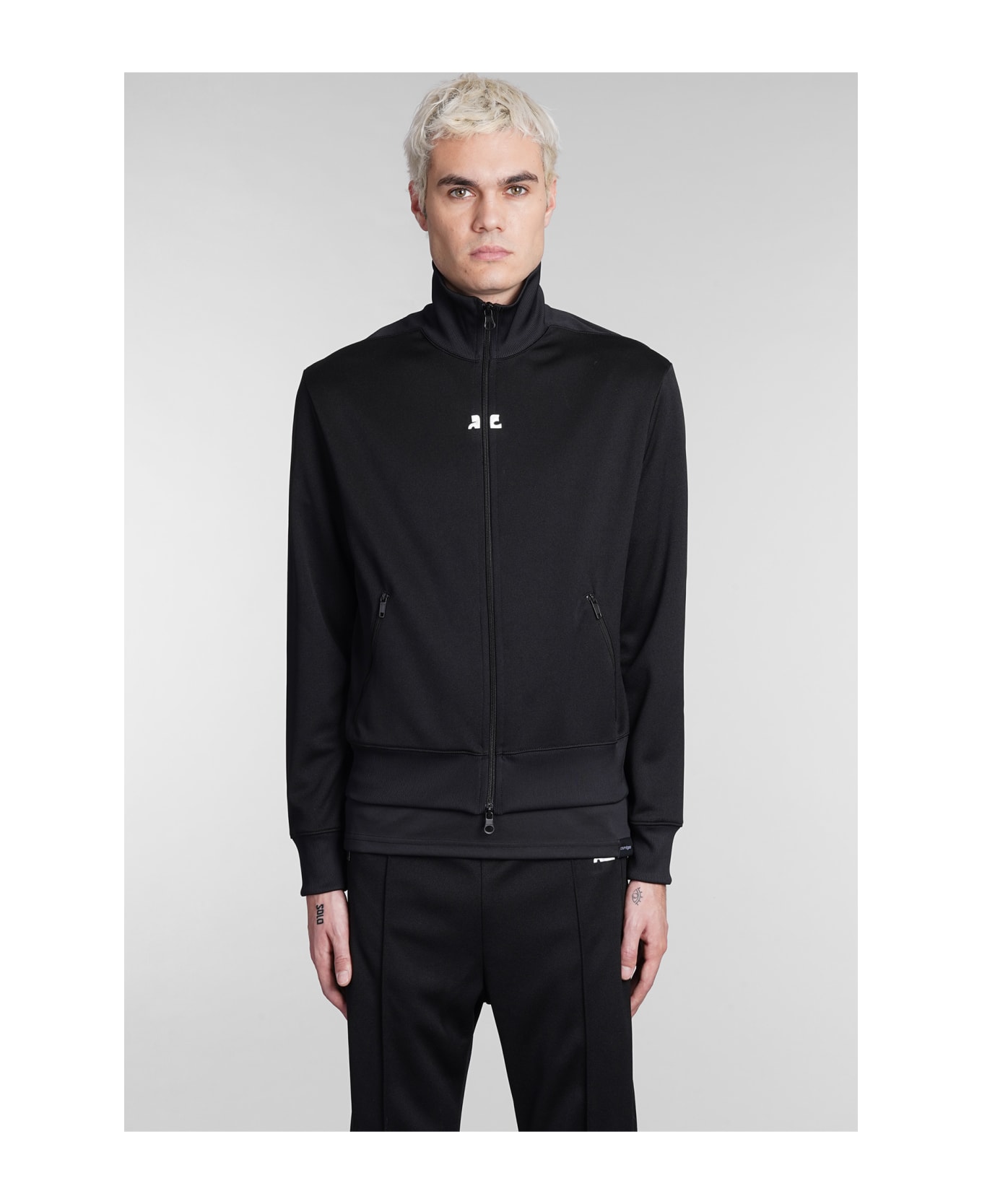 Sweatshirt in black polyester, high collar, zip clousure, long sleeves, ribbed cuffs and bottom, side pockets with zip, logo patch on front, 100% polyester, Made in Slovakia