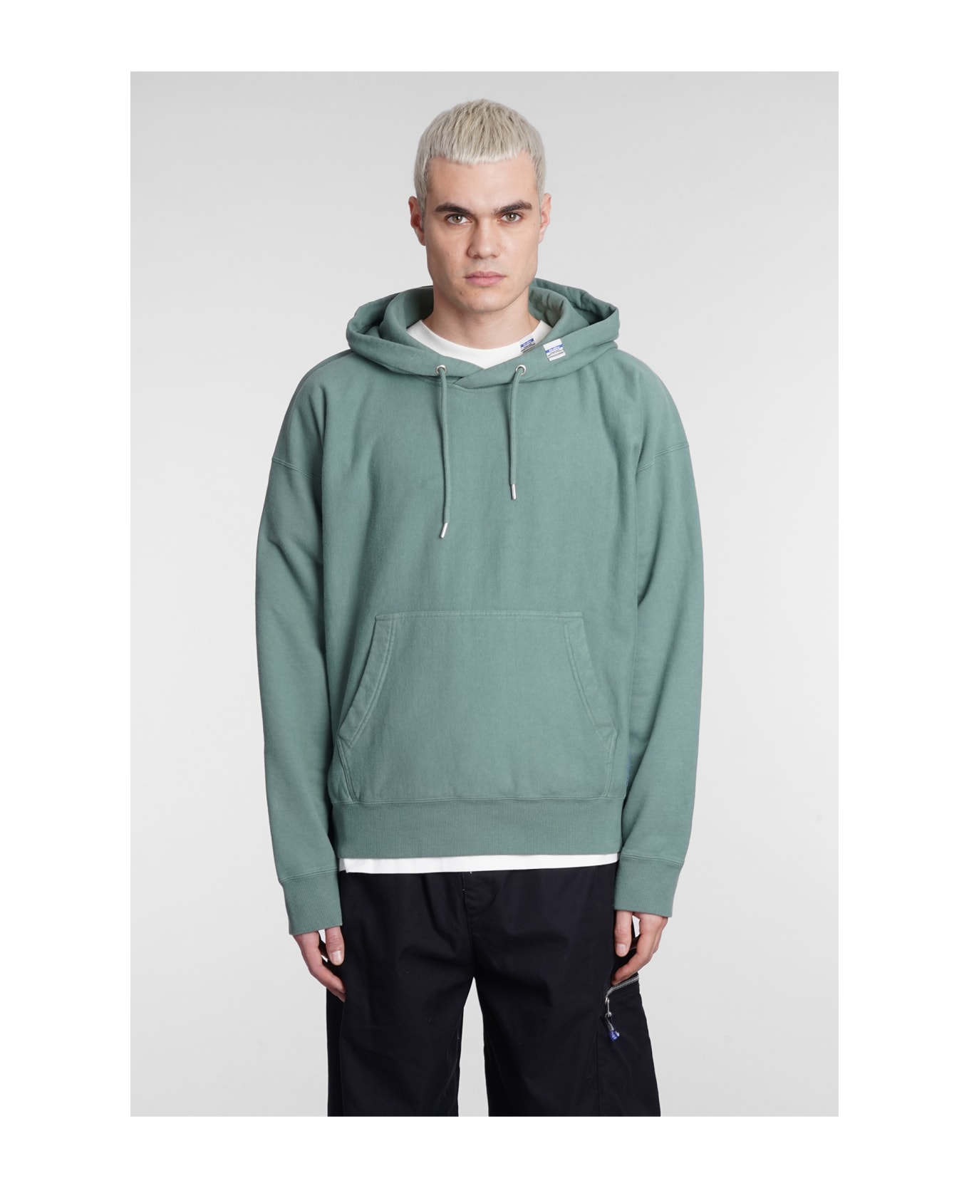 Sweatshirt in green cotton, adjustable hood with laces, kangaroo pockets, long sleeves, ribbed cuffs and bottom, 100% cotton, Made in Japan, Model is 1. 83 and wears size 46