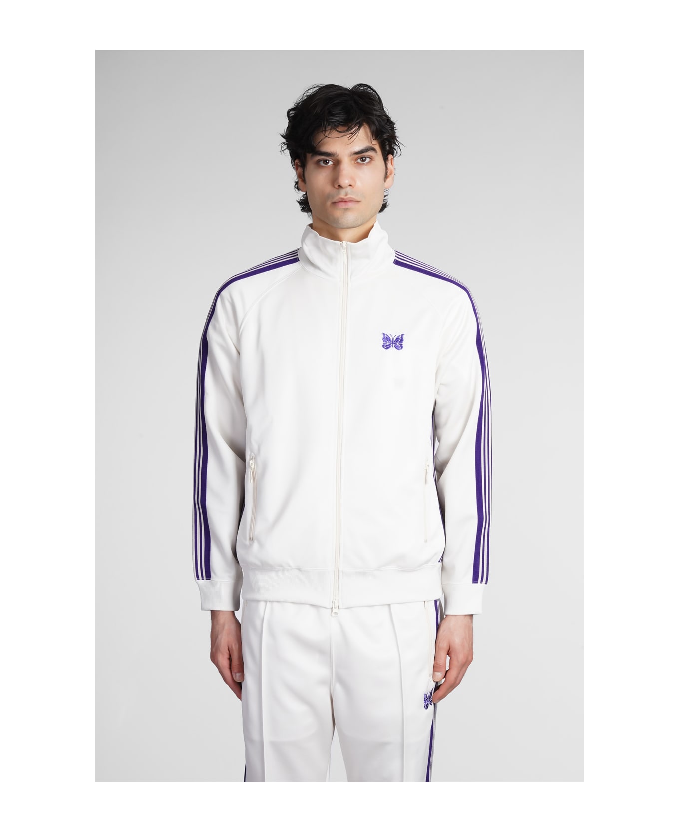 Sweatshirt in white polyester, high collar, side bands, embroidered logo on chest, pockets, zip clousure, 100% polyester, Made in Japan, Model is 1. 83 and wears size M