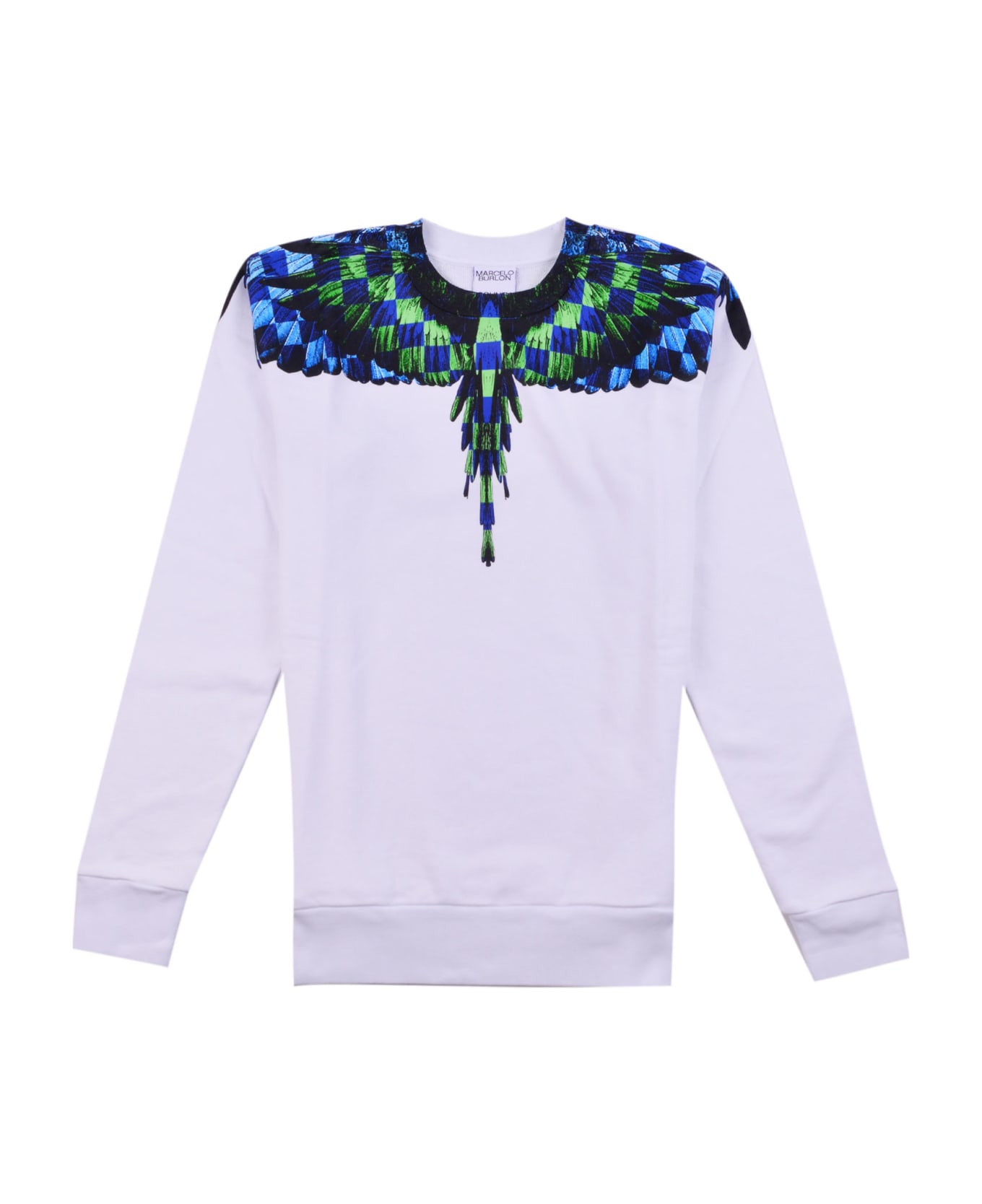 • white Sweatshirt With Blue And Green Checkered Aldi Printed On The Shoulders.