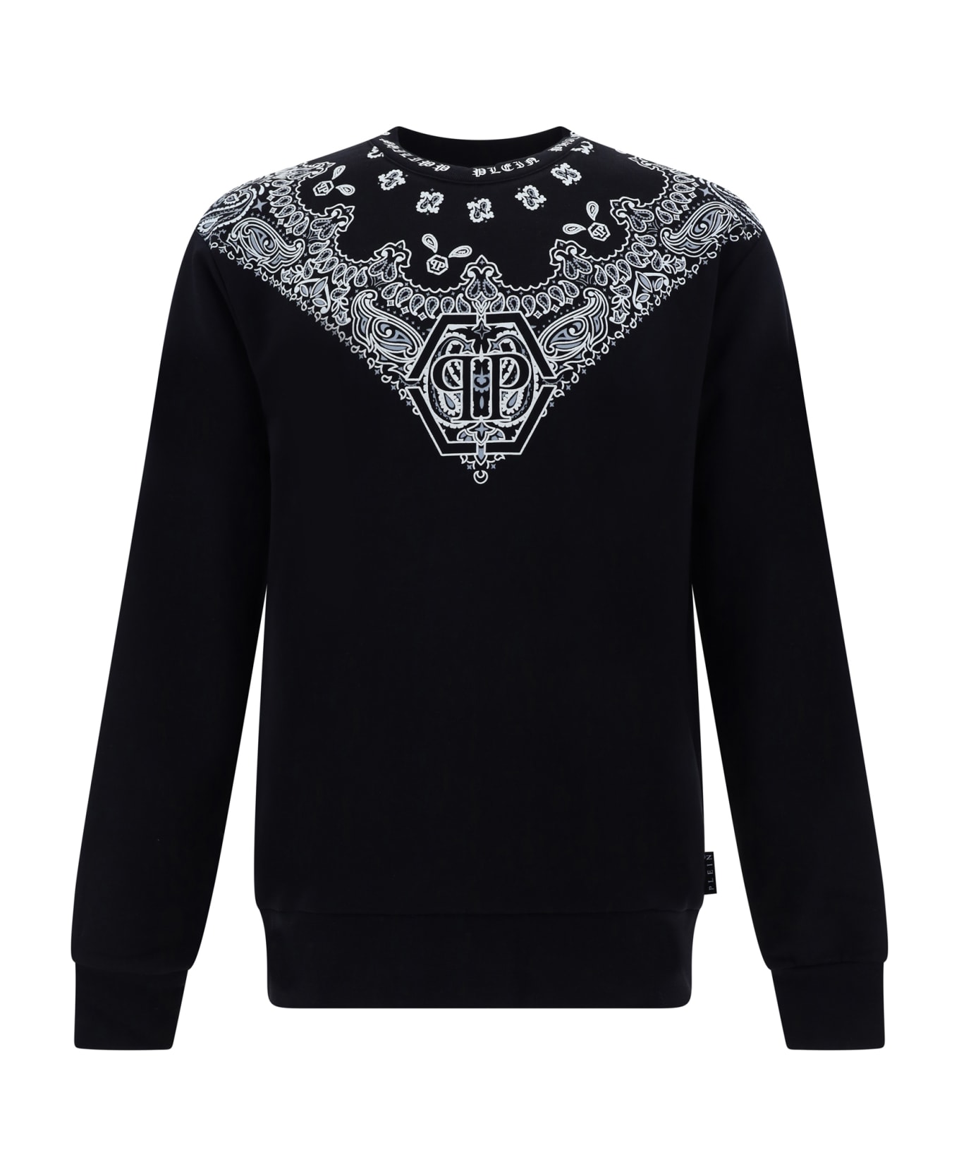 Cotton sweatshirt by philipp plein, ribbed crew neck, contrasting and embossed brand graphic and iconic logo on front and back, ribbed cuffs, ribbed hem, monochrome pattern, regular fit.