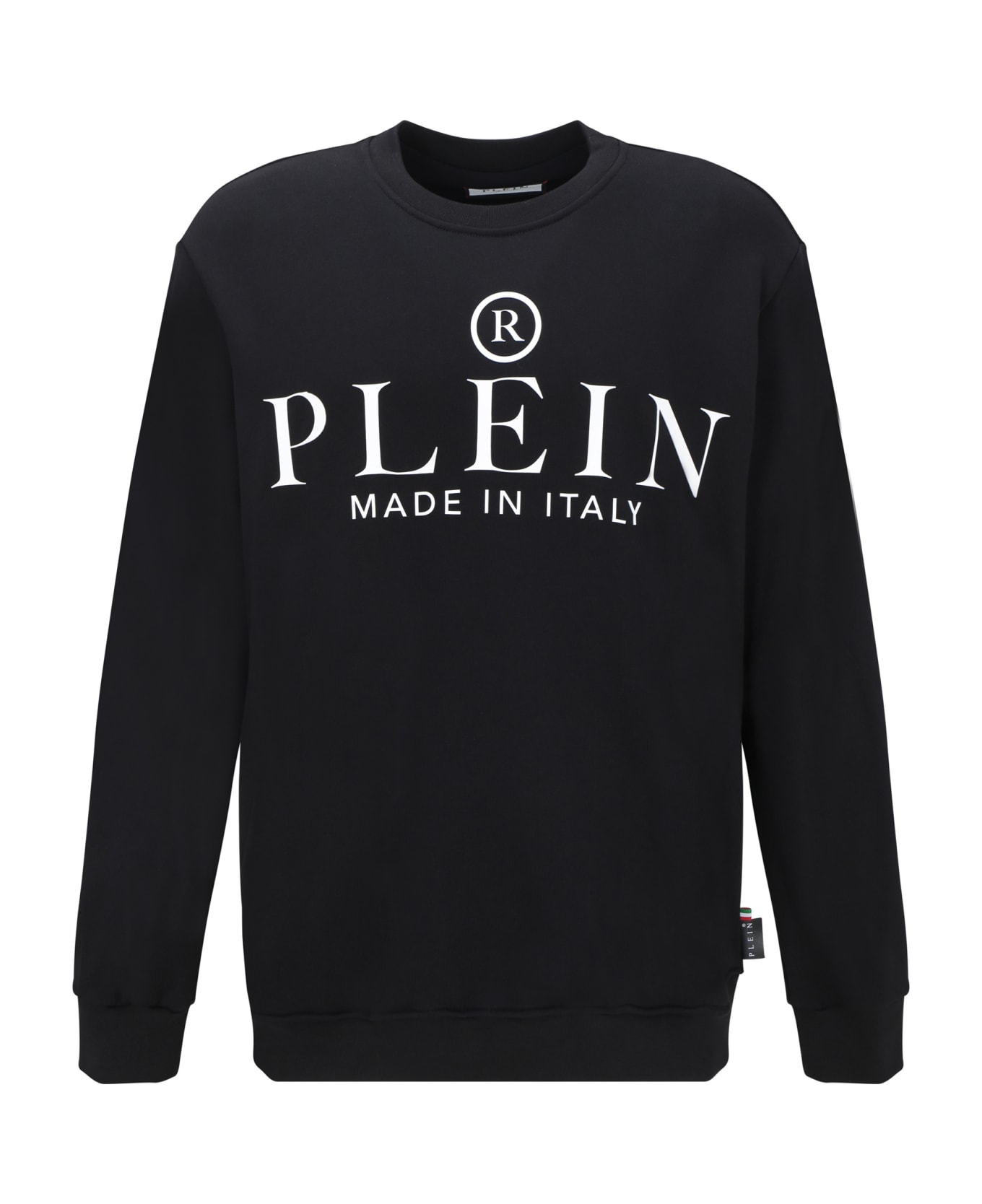 Cotton sweatshirt by philippe plein, ribbed crew neck, ribbed cuffs, iconic brand monogram applied in contrast on front, monochrome design, iconic logo plaque applied on back, regular fit.