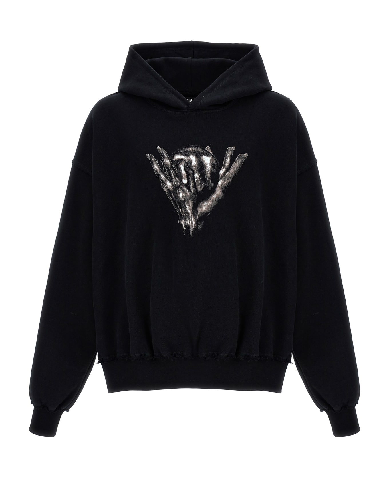 'The Dark Echo' cotton hoodie with front print, frayed details, long cuffed sleeves.