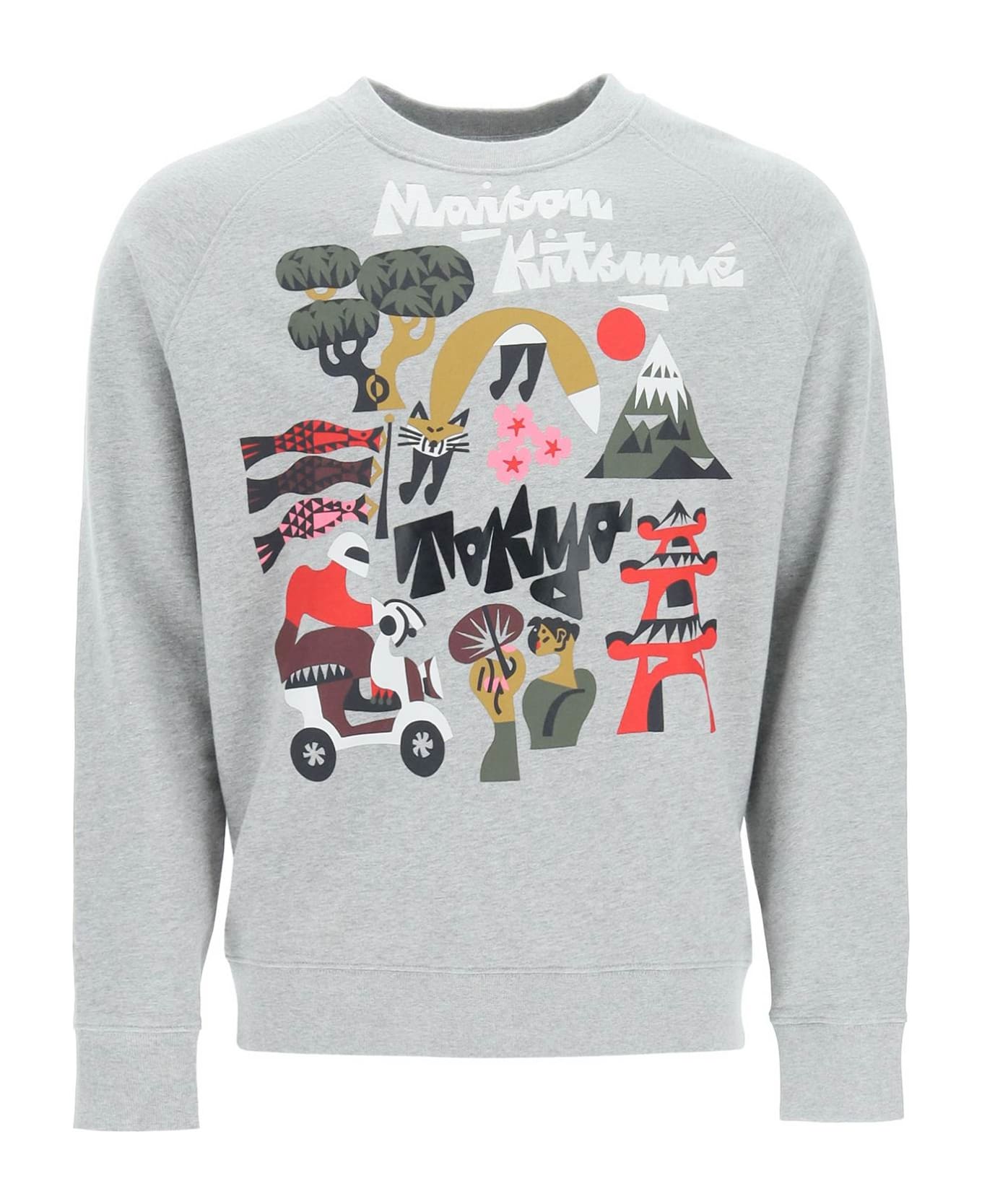 Crew-neck sweater by Maison Kitsuné in cotton French Terry with front "Tokyo" print created by the illustrator Bill Rebholz. It features Raglan sleeves and ribbed edges. Regular fit. The model is 187 cm tall and wears a size L.