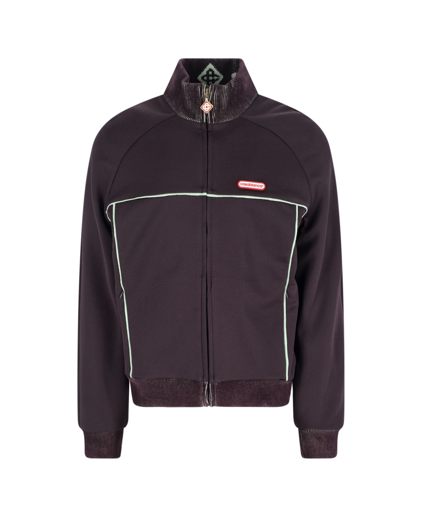 Casablanca 'Tricot' zip jacket in dark purple cotton blend with ribbed high neck, zip closure, logo zipper detail, contrast trims, contrast rubber logo embroidery at the front, two side zip pockets, rubber logo embroidery at the back, ribbed trims, straight hem.