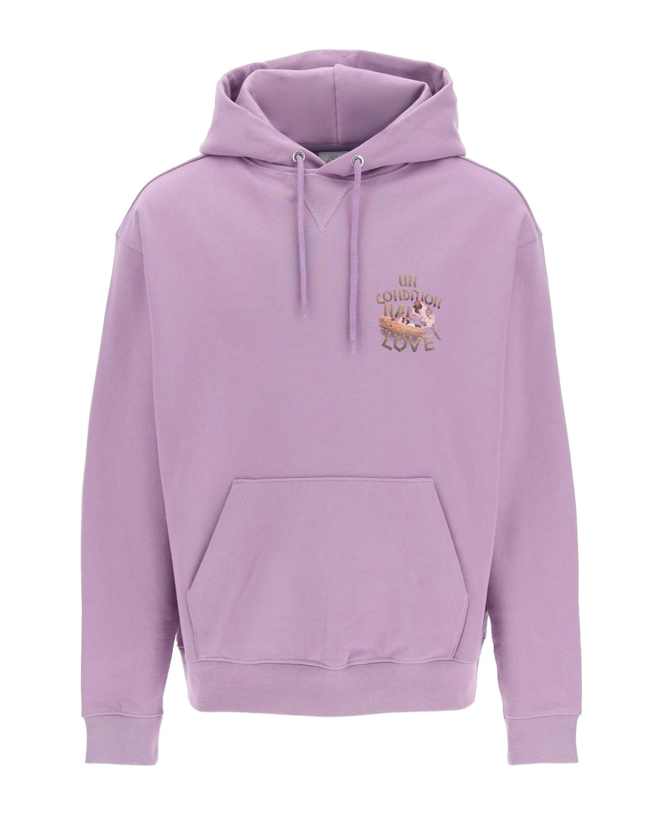 Sky High Farm organic cotton hoodie with "Unconditional Love" logo prints on chest and back. Drawstring hood and kangaroo pocket. Brushed back fleece interior and ribbed trim. Loose fit. Model is 185 cm tall and wears size L.
