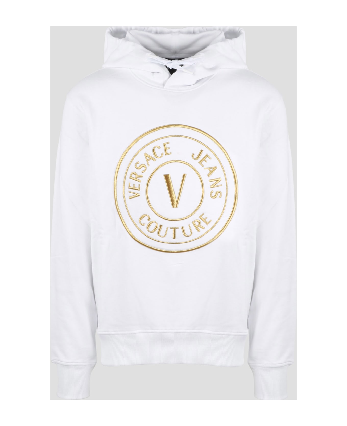 Versace Jeans hooded sweatshirt in cotton jersey with V-Emblem embroidery on the front. - SS23 - Regular fit - Drawstring hood - Contrasting V-Emblem embroidered on the front - Ribbed cuffs and bottom - Made in Turkey - 100% Cotton