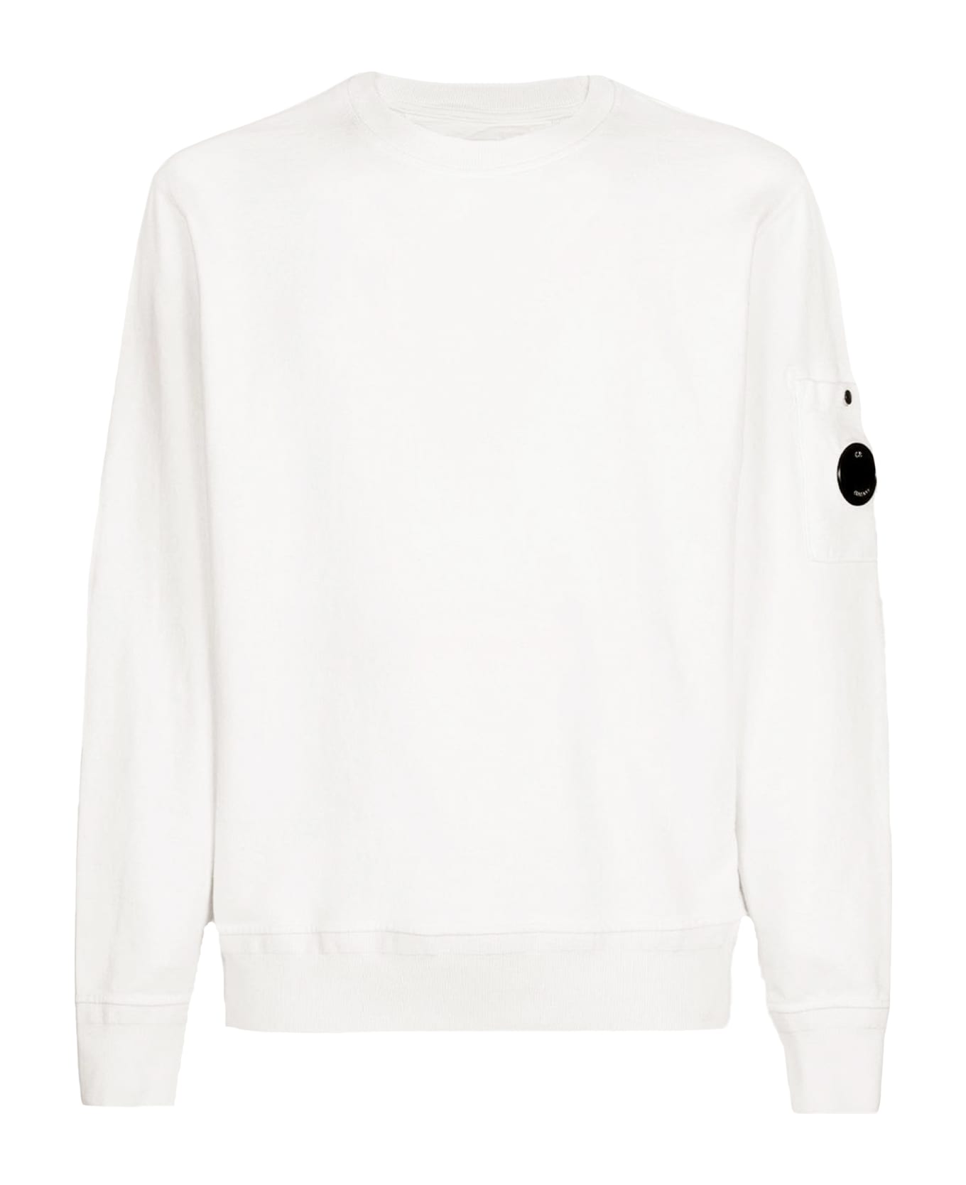White cotton sweatshirt featuring crew neck, ribbed collar, hem and cuff, lens detail, garment dyed