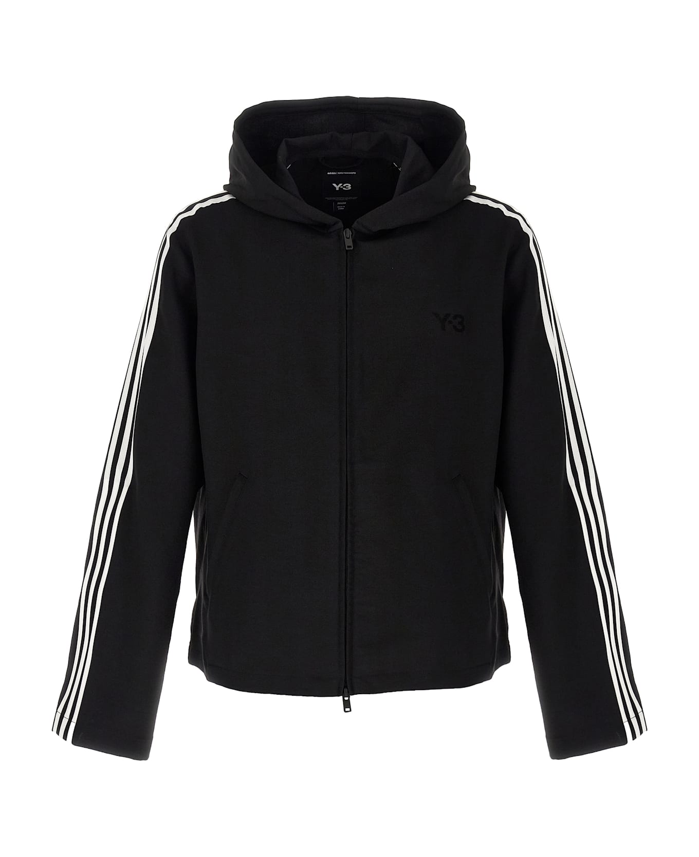 'Y-3 3-Stripes' hoodie in lyocell, nylon and sheep wool blend with contrast details, tone-on-tone logo and front zip closure, long flared sleeves with dropped shoulders, part of the strips are reinforced with wire.