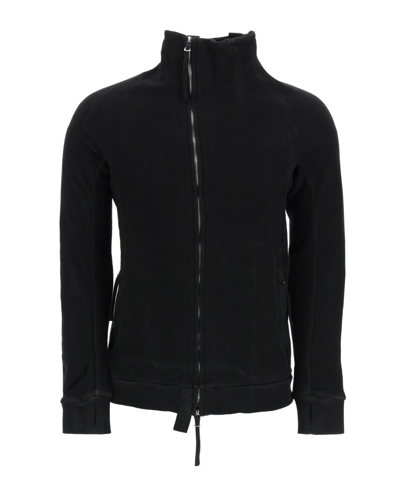 Zip-up sweatshirt in brushed-back ribbed cotton jersey by Boris Bidjan Saberi, handcrafted and vinyl coated. It features an asymmetric two-way zip closure, funnel neck and side zipped welt pockets. Rib-knit hem and thumbhole cuffs. Finished with signature drawstring detail at back and with sterling silver hardware. Webbing shoulder straps and two pockets on the inside. Slim fit. The model is 187 cm tall and wears a size L.