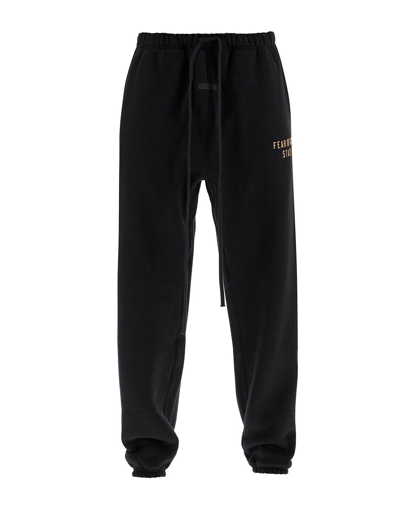 The Fear Of God Essentials sweatpants are made of a soft brushed cotton blend. They feature a relaxed fit with side seam pockets, an elastic waistband with drawstring, and elasticized cuffs. The logo is printed on the side, and there is a rubber label on the front. The model is 182 cm tall and wears size M.