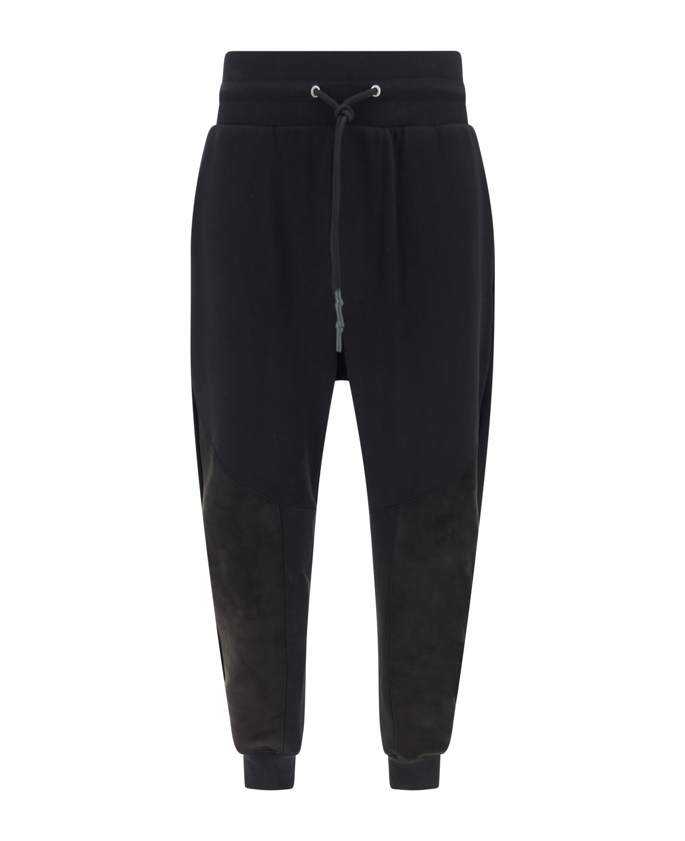 Cotton jogger pants by les hommes, elasticated waistband adjustable by drawstring, ribbed hem, monochrome design with suede inserts, two side welt pockets, regular fit.