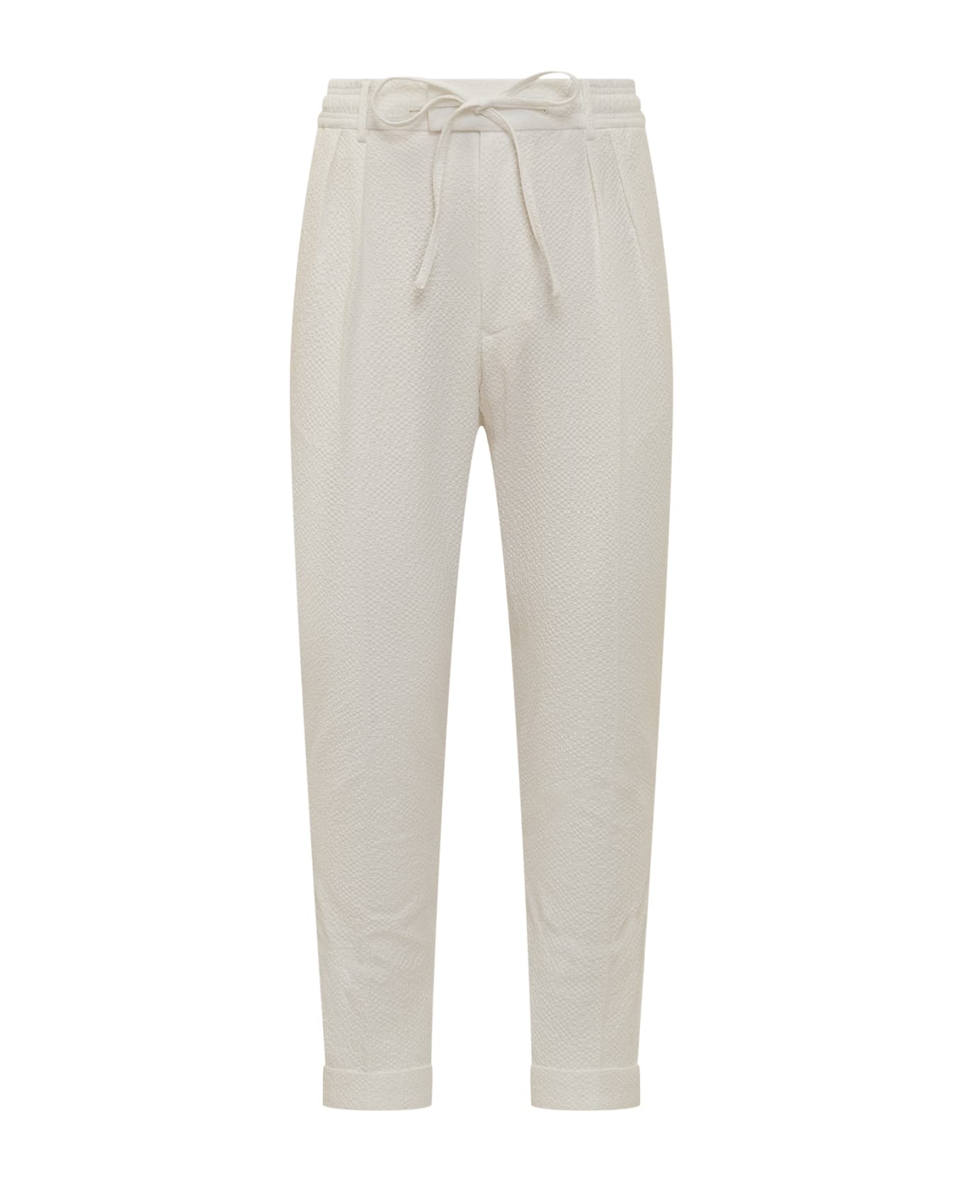Long pants. Hook and zip closure. Two side pockets and two back pockets. Belt loops. Drawstring waist.