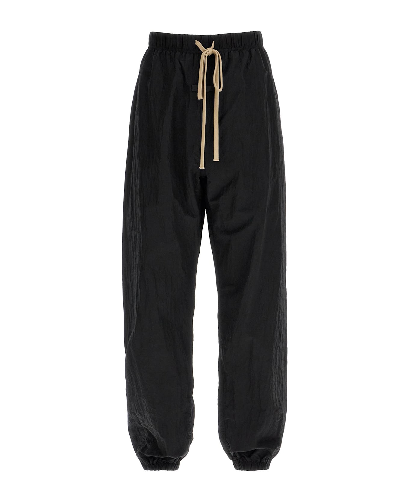 The Fear Of God Essentials track pants are made of crinkled nylon ripstop and lined with perforated technical fabric. They feature a classic extra-long drawstring waist, low crotch, and are finished with the iconic rubber logo patch in tone on the front. Elasticized ankles with zip openings complete the garment. The model is 182 cm tall and wears size M.