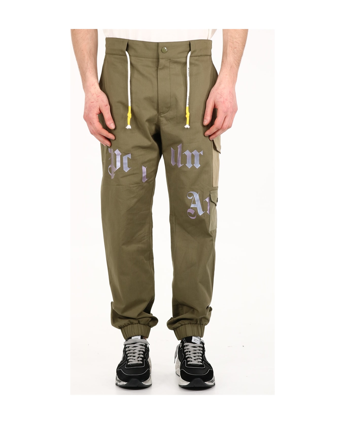 Military green cotton cargo pants with logo print on the front. Side pockets and along the legs. Drawstring waist, zip and button closure. Elasticated bottom. The model is 181 cm tall and wears size 48IT / M Composition: 100% Cotton