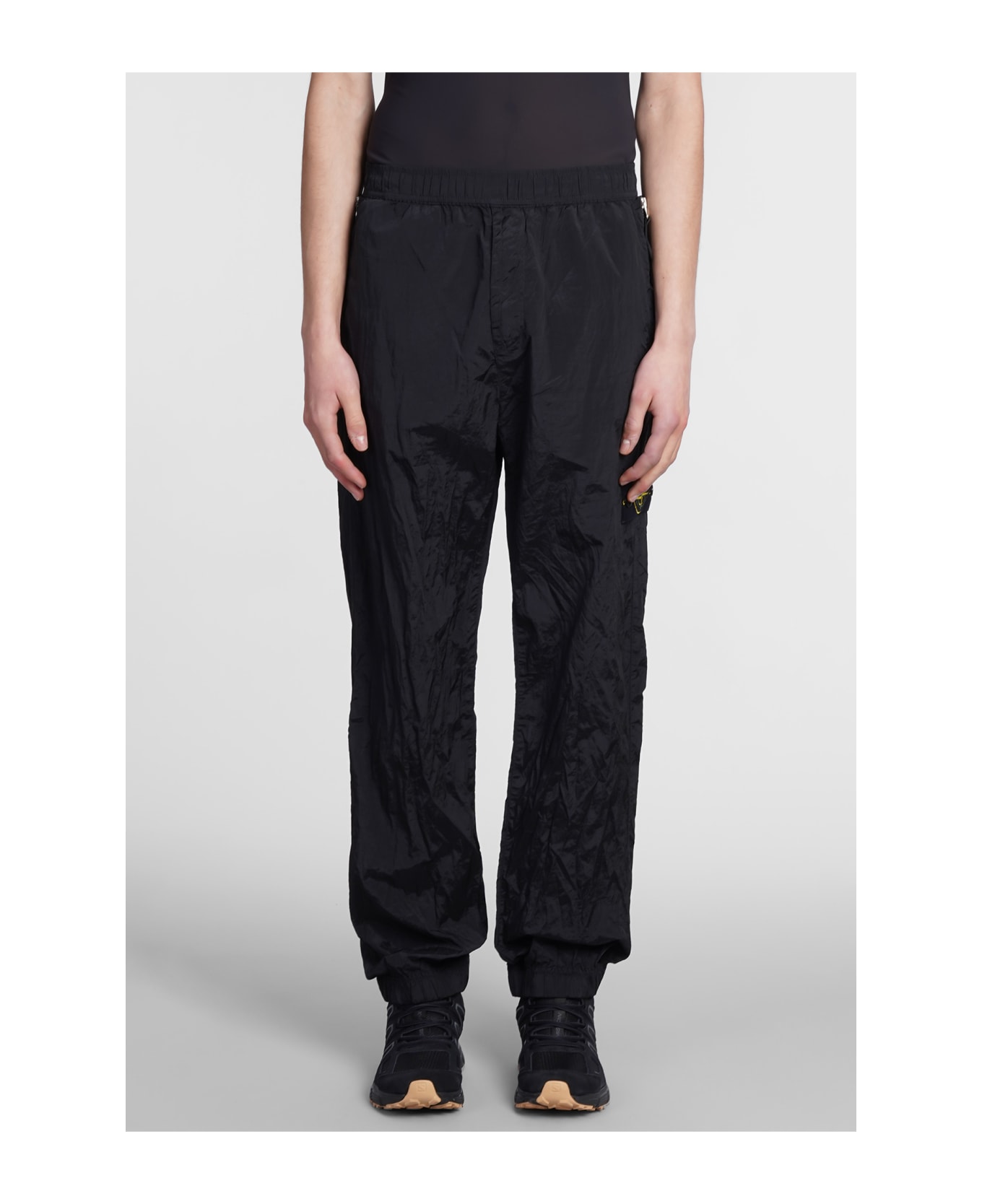 Pants in black polyamide, elastic waist, side patch logo, cargo pockets, elastic hem, 100% cotton, Made in Romania, Model is 1. 83 and wears size 31