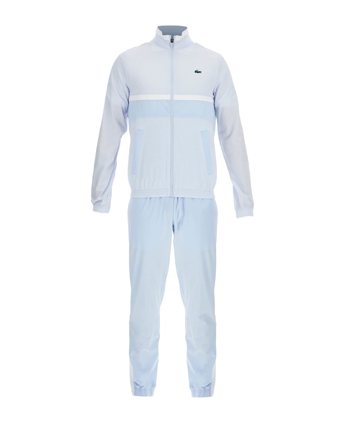 The Lacoste sportswear tracksuit is made of technical fabric, with a seersucker jacket and crepe pants for a patchwork look. The zip-up jacket features contrasting stripes and a logo appliqué on the chest. It has a raised collar, side pockets with zippers, and a mesh lining. The pants are finished with contrasting side stripes, elastic waistband and cuffs, and a logo appliqué on the side. An internal drawstring at the waist, side pockets, and