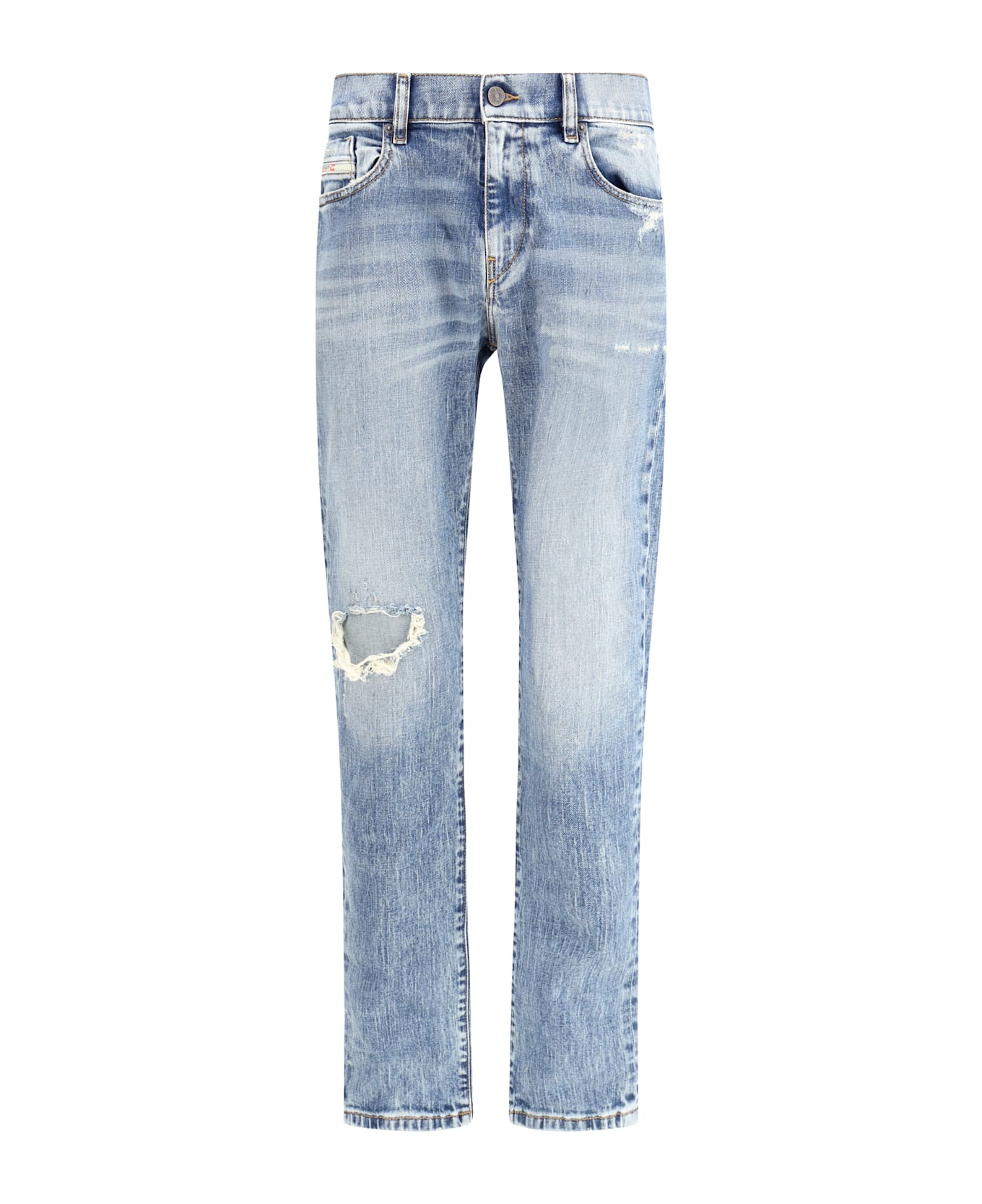 Diesel's 2019 d-strukt jeans combine a vintage aesthetic with contemporary details for a look with a strong character. made from cotton, they feature a mid-rise and a slim leg that enhances the silhouette without sacrificing comfort. the worn-effect design, enhanced by a ripped and repaired patch on the knee, lends an authentic, worn-in appeal. the straight five-pocket style is complemented by a front button and zipper closure, belt loops at the waist and the brand's iconic logo-printed leather patch on the back, a hallmark of the brand.