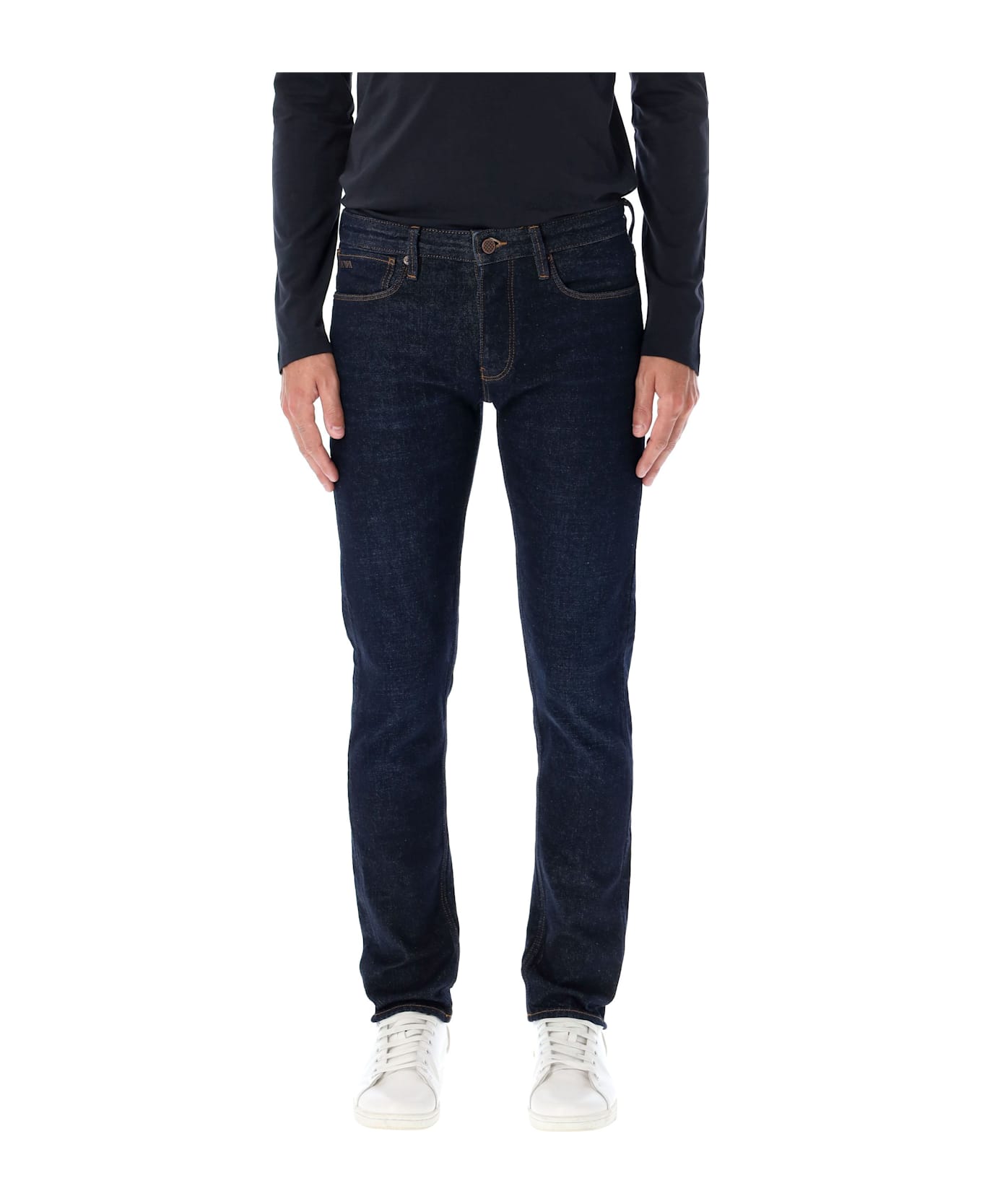 5 Pockets Pants By Emporio Armani. Featuring: Slim Fit Dark Indigo Denim Fabric Button And Zip-front Closure Classic Five-pocket Design Back Pocket With Emporio Armani Eagle Logo Leather Logo Patch On The Waistband Contrast Stitching Model Is 1,90m And Wears Size 32.