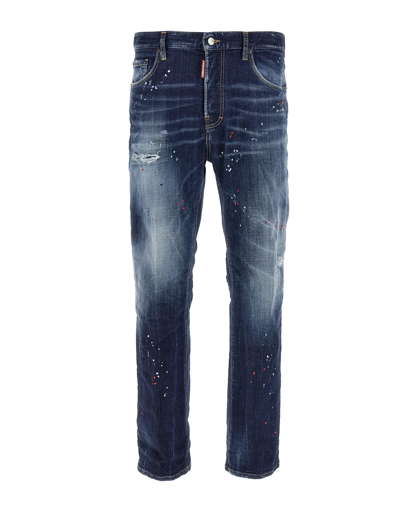 '642' cotton denim jeans with used-effect details, button closure, five pockets, leather logo tag.