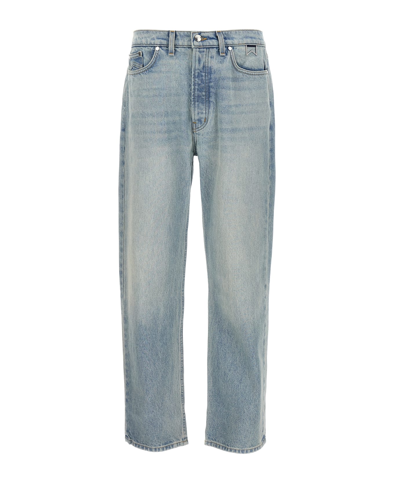 90s jeans in delavé cotton denim with straight leg, button closure, five pockets, and leather logo label on the back.