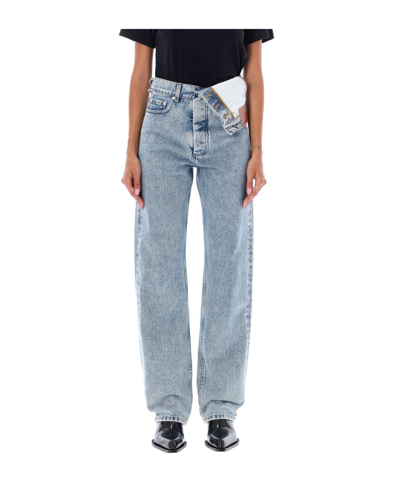 Asymmetric Waist Jeans By Y-project. Featuring: Asymmetric High Waist Front Button Closure Slant Side Pockets Belt Loops Rear Patch Pockets Stitching Details "y-project" Logo Patch Model Is 1,72 M Tall And He Is Wearing Size 26 Model Is 1,90 M Tall And He Is Wearing Size 33