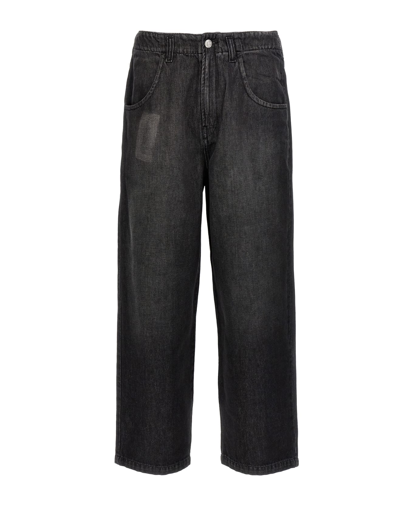 Cotton denim baggy jeans with zipper and button closure, pockets, shadow detail resembling the shape of the smartphone inside the pocket.