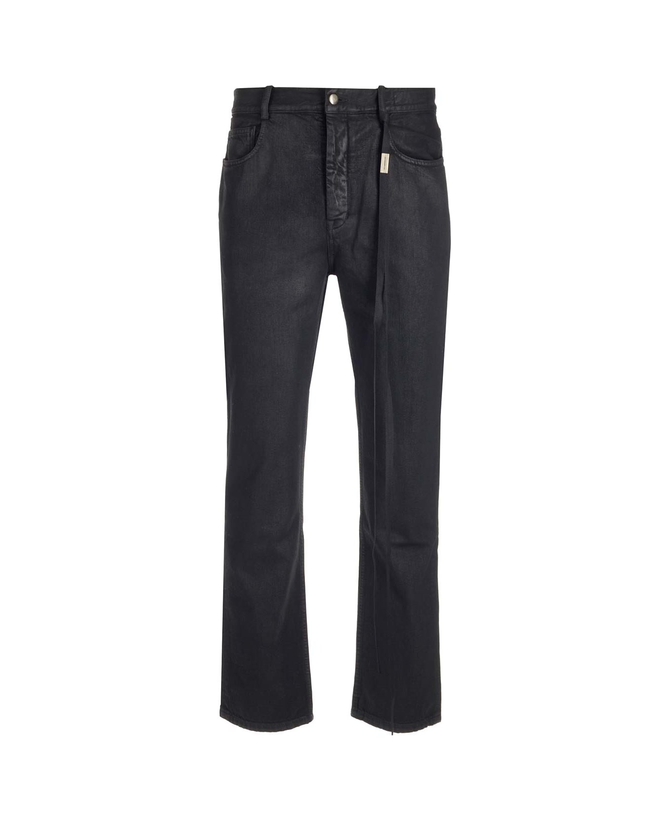 Black "Gill" 5-pocket jeans in coated cotton with regular fit and black ribbon knotted on the loop from Ann Demeulemeester.