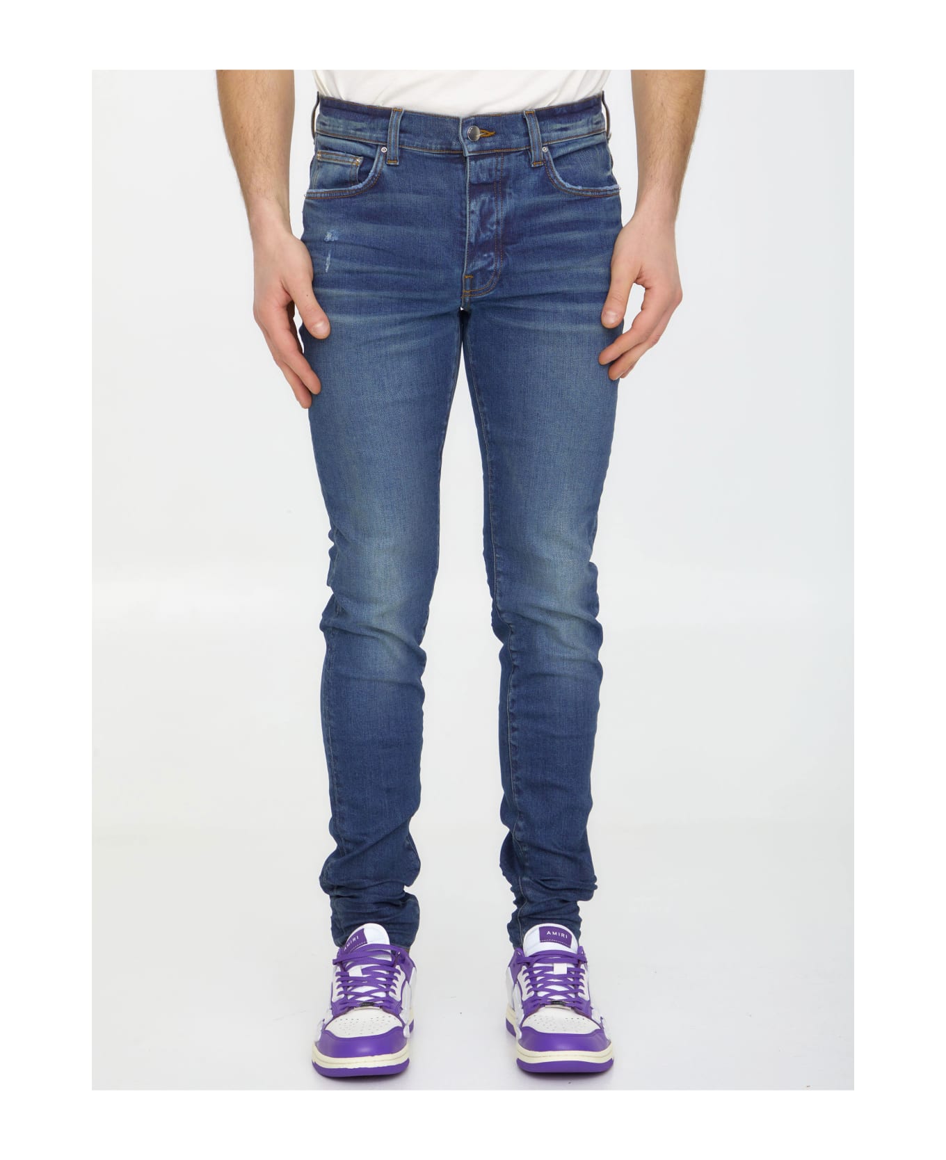 Skinny jeans in stretch blue denim with washed-out effect. It features distressed details, button closure, five-pocket design, Amiri patch at the back and belt loops. The model is 190cm tall and wears size 32.