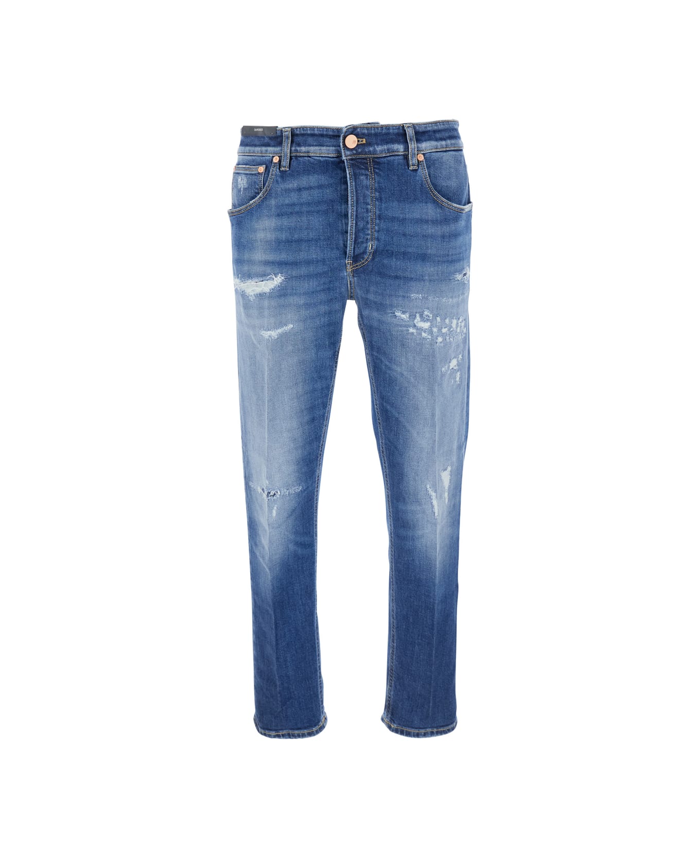 Blue Five Pocket Jeans With Rips And Logo Patch On The Back In Denim Man