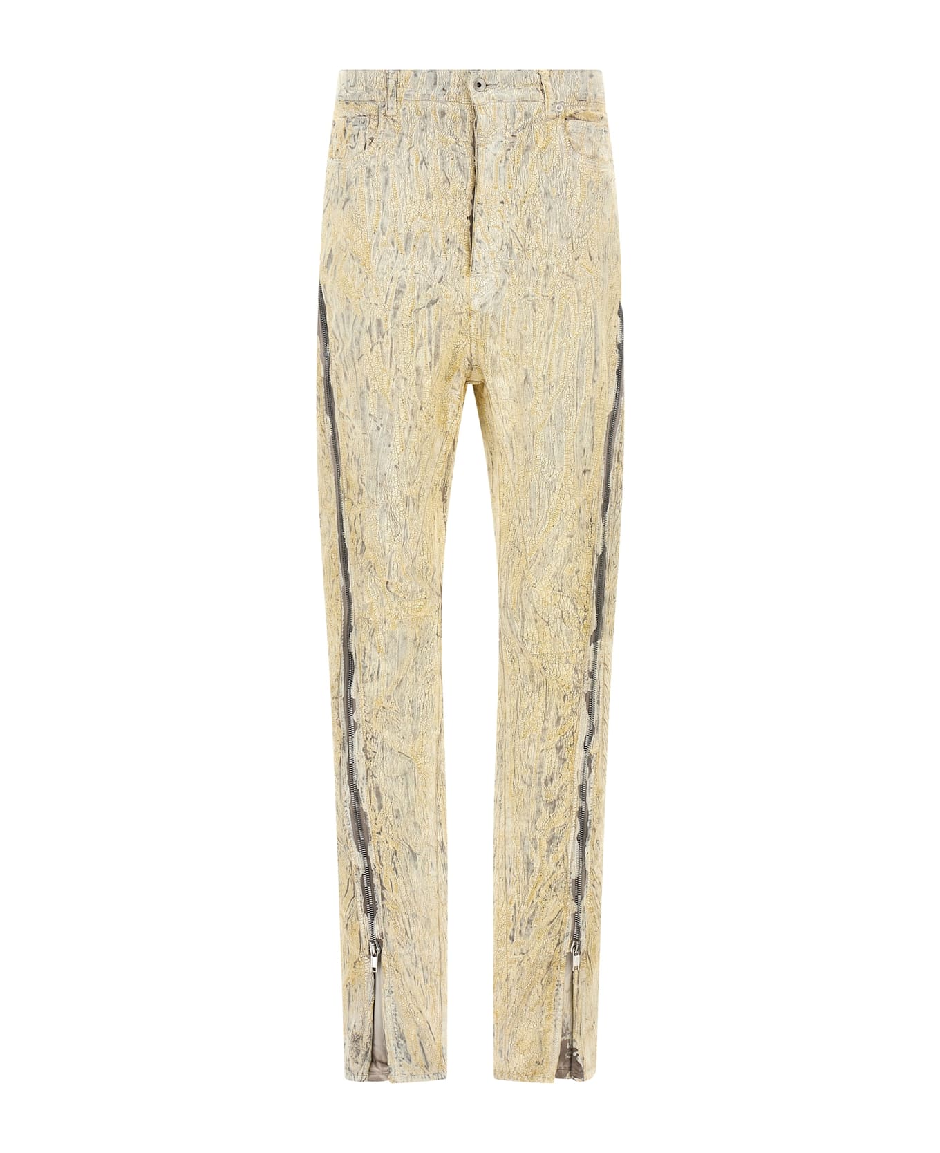 'Bolan Banana' megacrust cotton denim jeans overdyed in powder and treated with layers of gold foil, high-waisted model with adjustable boot leg thanks to the zip, five pockets, button closure, raw cut on the leg bottom. The natural aspects of this treatment cause the application of the film to be uneven, peel off and crack in some areas and will continue to do so with wear and abrasion. This is an intrinsic feature of this type of treatment and is a desired visual aspect that adds to the uniqueness of each piece and should not be considered a defect.