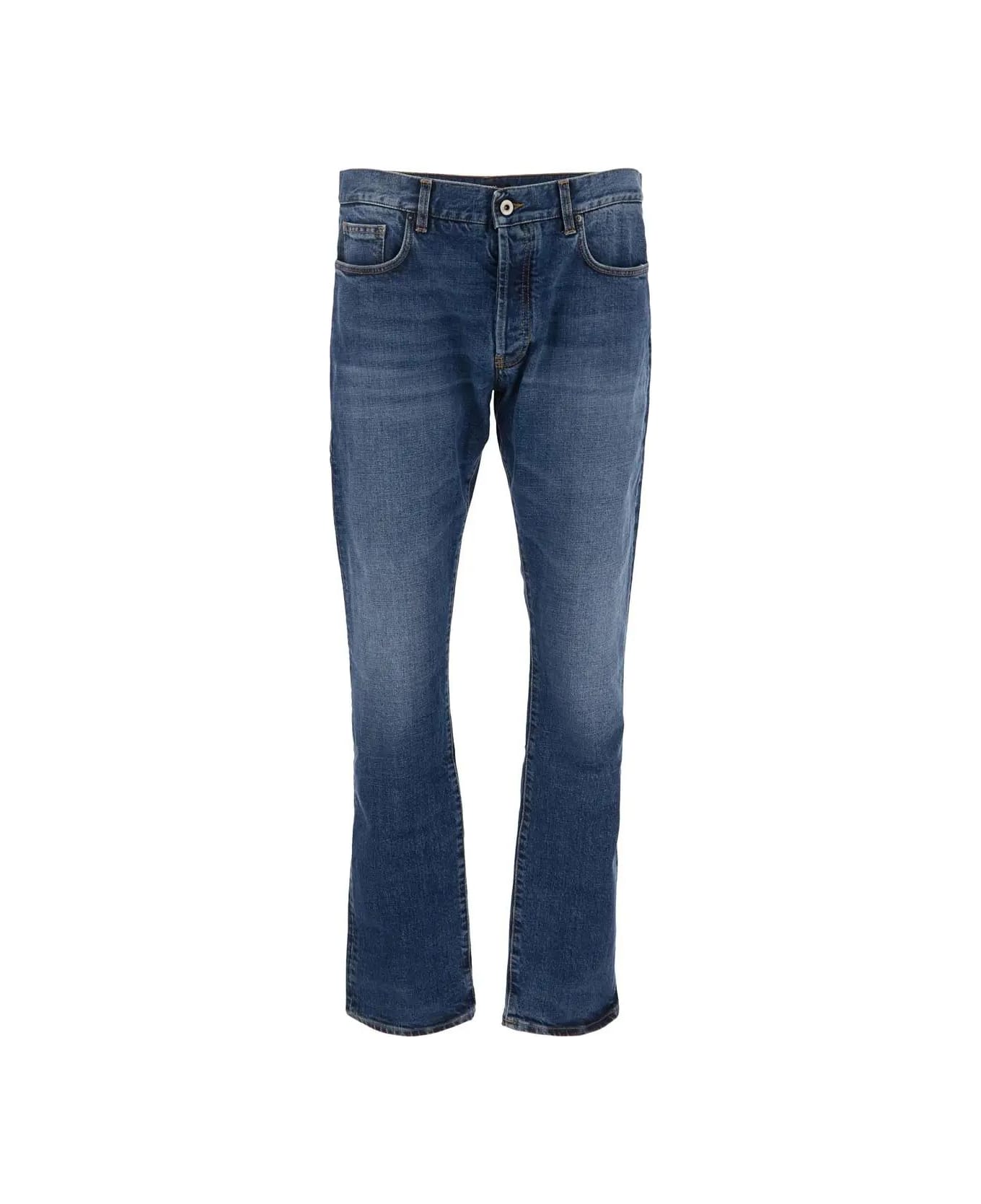 14 Bros jeans in mid blue denim cotton with slim fit, belt loops, five-pocket design, button fly closure and back embroidery logo patch.