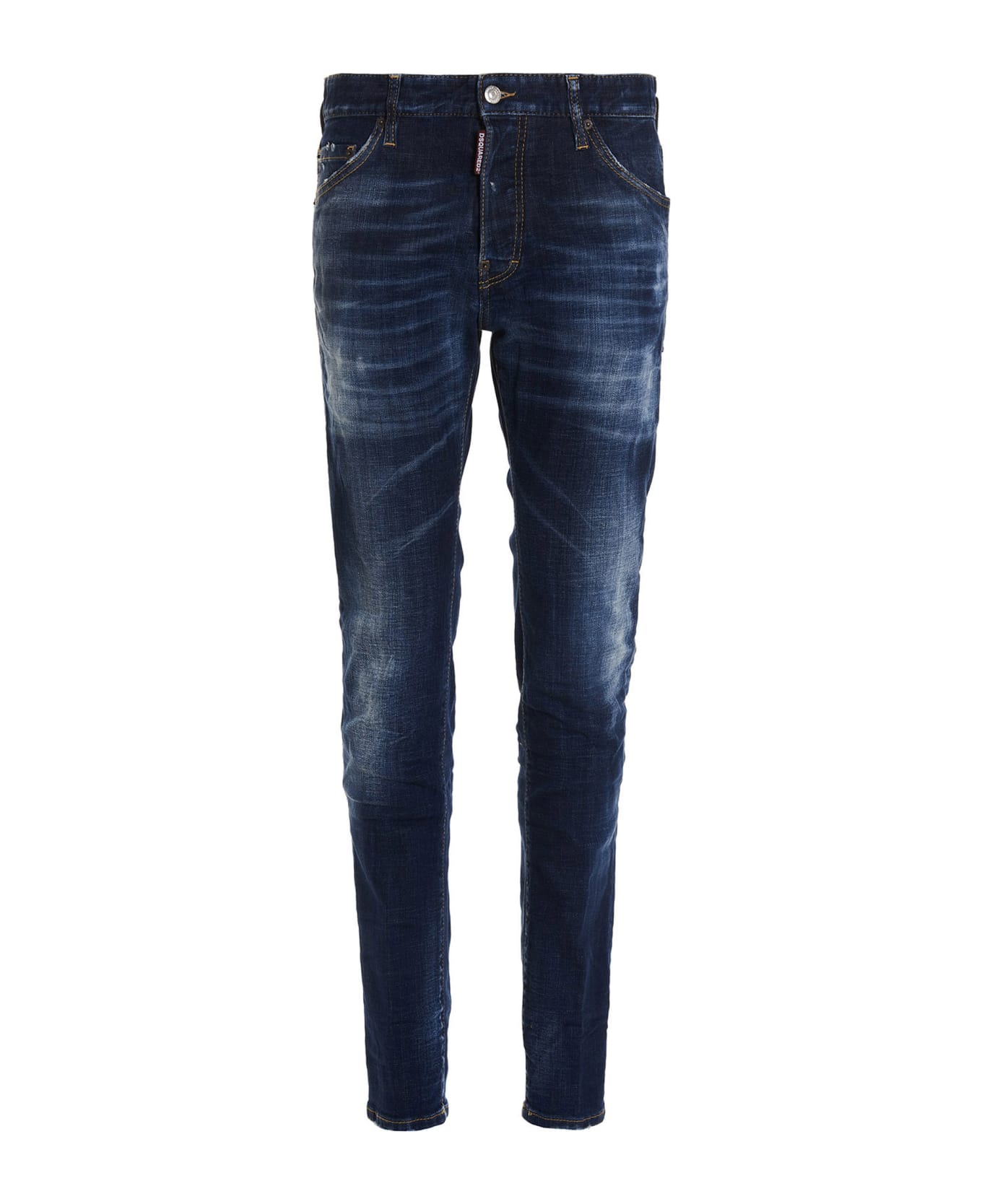 'Cool Guy' cotton denim jeans with button closure, five pockets, distressed details, back print, and leather logo tag.