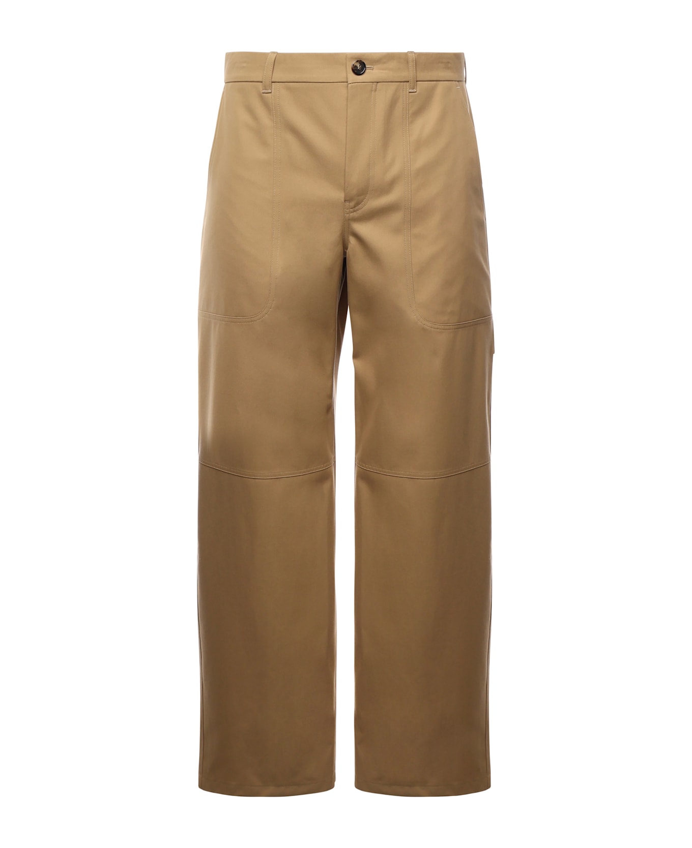 -Front carpenter pockets and back buttoned cargo pockets -Relaxed fit -Mid-rise and straight leg -Concealed zip fastening -Back welt pocket -Leather appliqué with embossed LOEWE lettering on the back -Size shown in the photo is 48 -Color: Beige