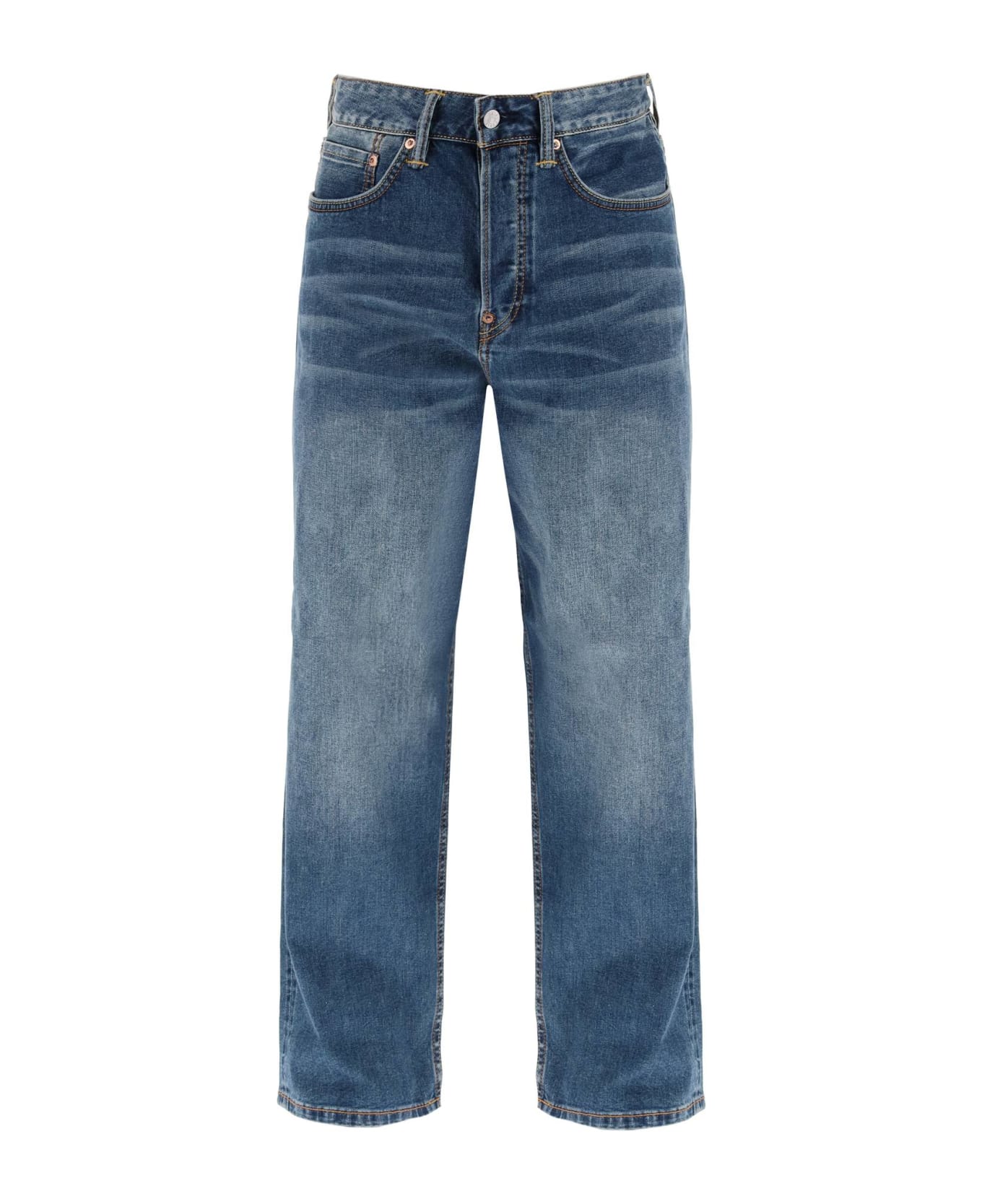 Evisu five-pocket baggy jeans made of slightly stretch denim printed with Daicock motif and graffiti-style logo on the back. Finished with contrast stitching, they feature back welt pockets with selvedge detail, and a logo button fly. The model is 187 cm tall and wears a size 31.