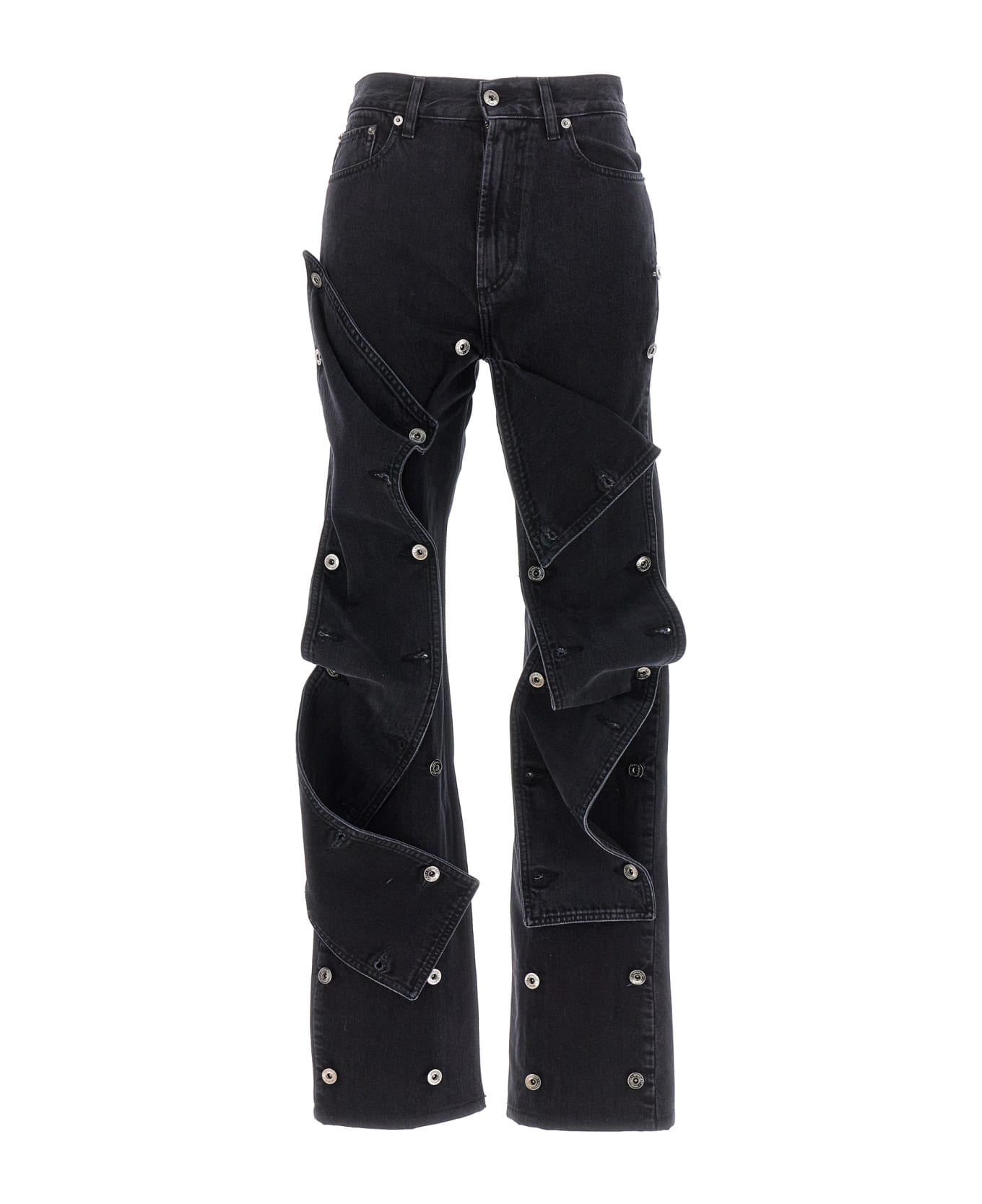 'Evergreen' cotton denim jeans with zip and button closure, five pockets, removable front denim patches detail.
