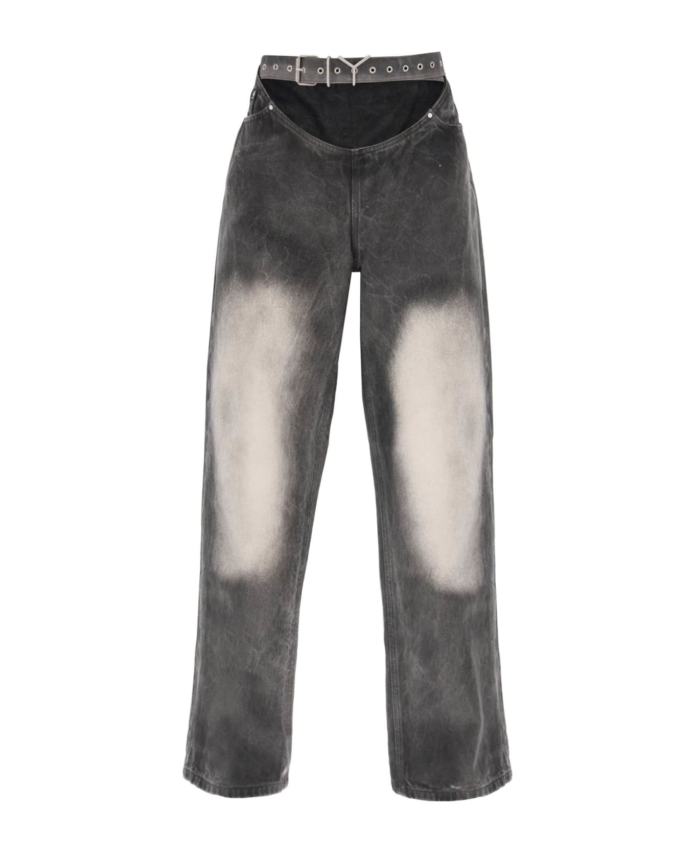 Unisex five-pocket jeans by Y-Project made of faded pure cotton denim, featuring cut-out waist and adjustable belt with monogram buckle. Back jacron, loose fit. The model is 187 cm tall and wears a size 31.