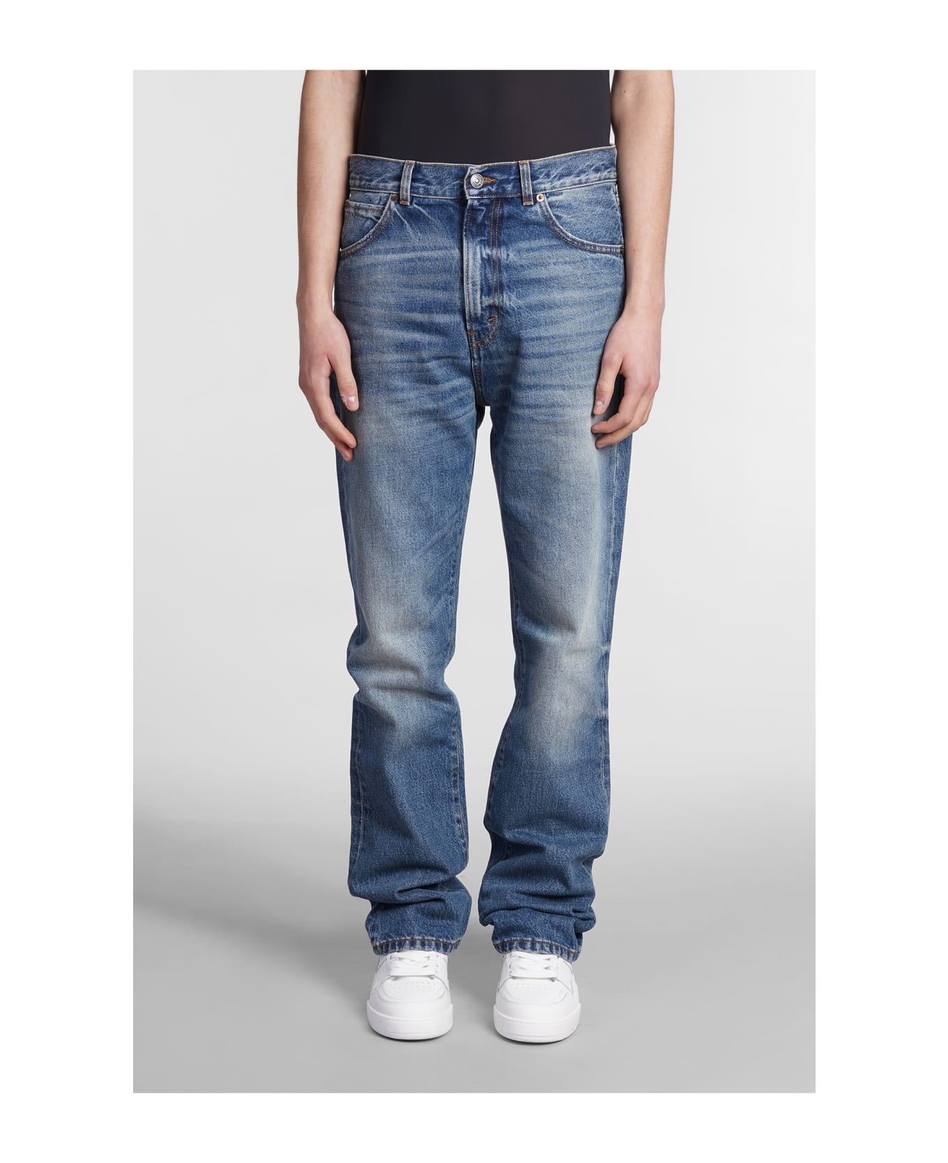 Fergus Jeans in blue cotton, button and zip closure, five pockets, waist belt loops, Model is 183 cm and wears 30 , 100% cotton, Made in Italy