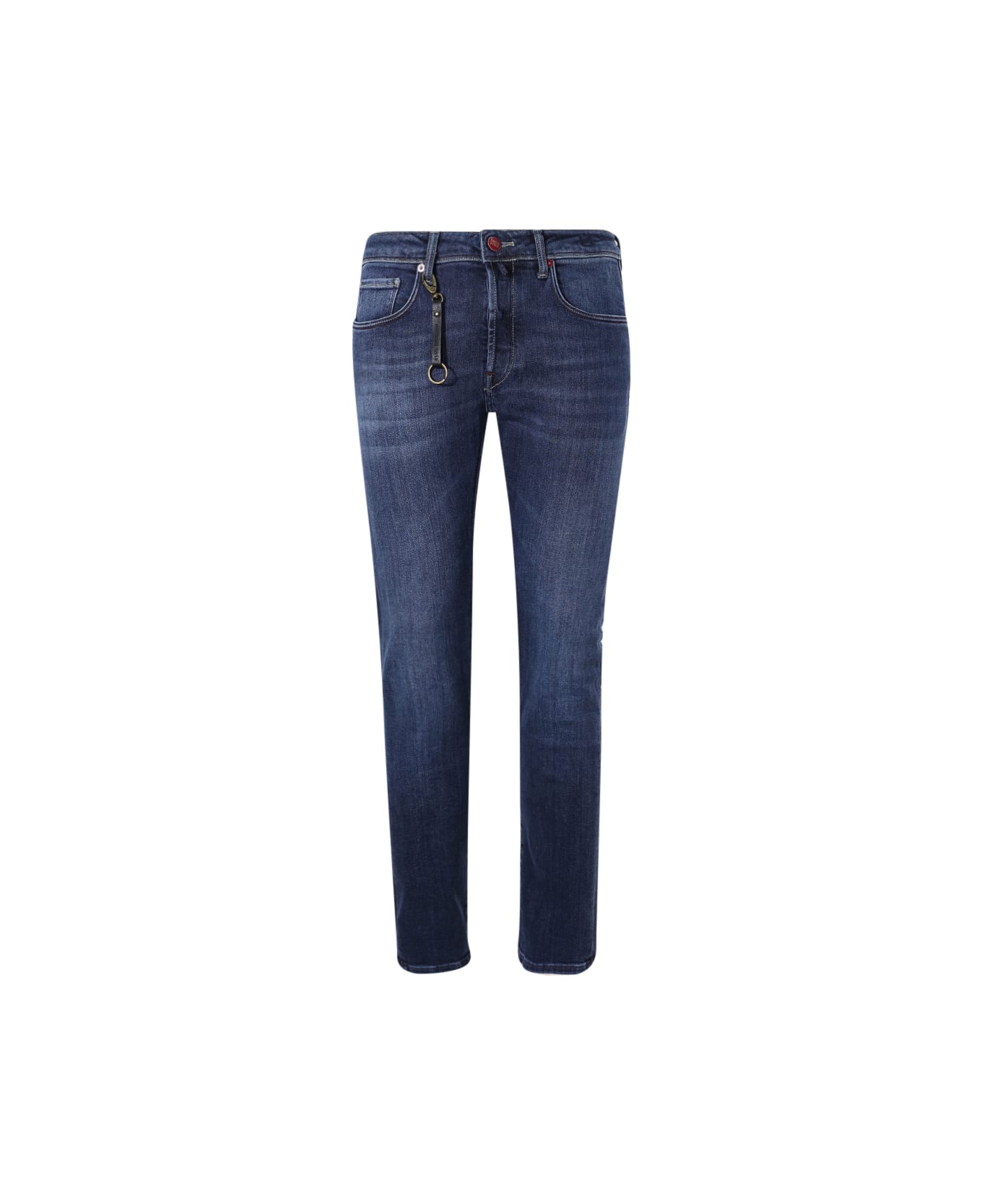 Button and concealed zip closure, classic five pocket design, contrasting logo on the back, removable key ring. Slim Fit. Blue color. Composition: 95% Cotton, 3% Polyester, 2% Elastane. Made in Italy