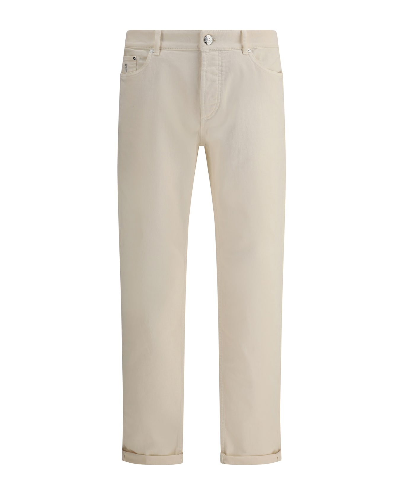 Brunello cucinelli's cotton jeans are a timeless and versatile piece with a classic five-pocket design. the front button closure and belt loops at the waistband allow for a comfortable and adjustable fit. the distinctive detail is the iconic leather patch with the brand's signature press-stamped signature, applied to the back, which adds a touch of understated elegance. the embroidered logo on the front breast pocket and turn-up hem complete the design, giving it a refined, polished look.