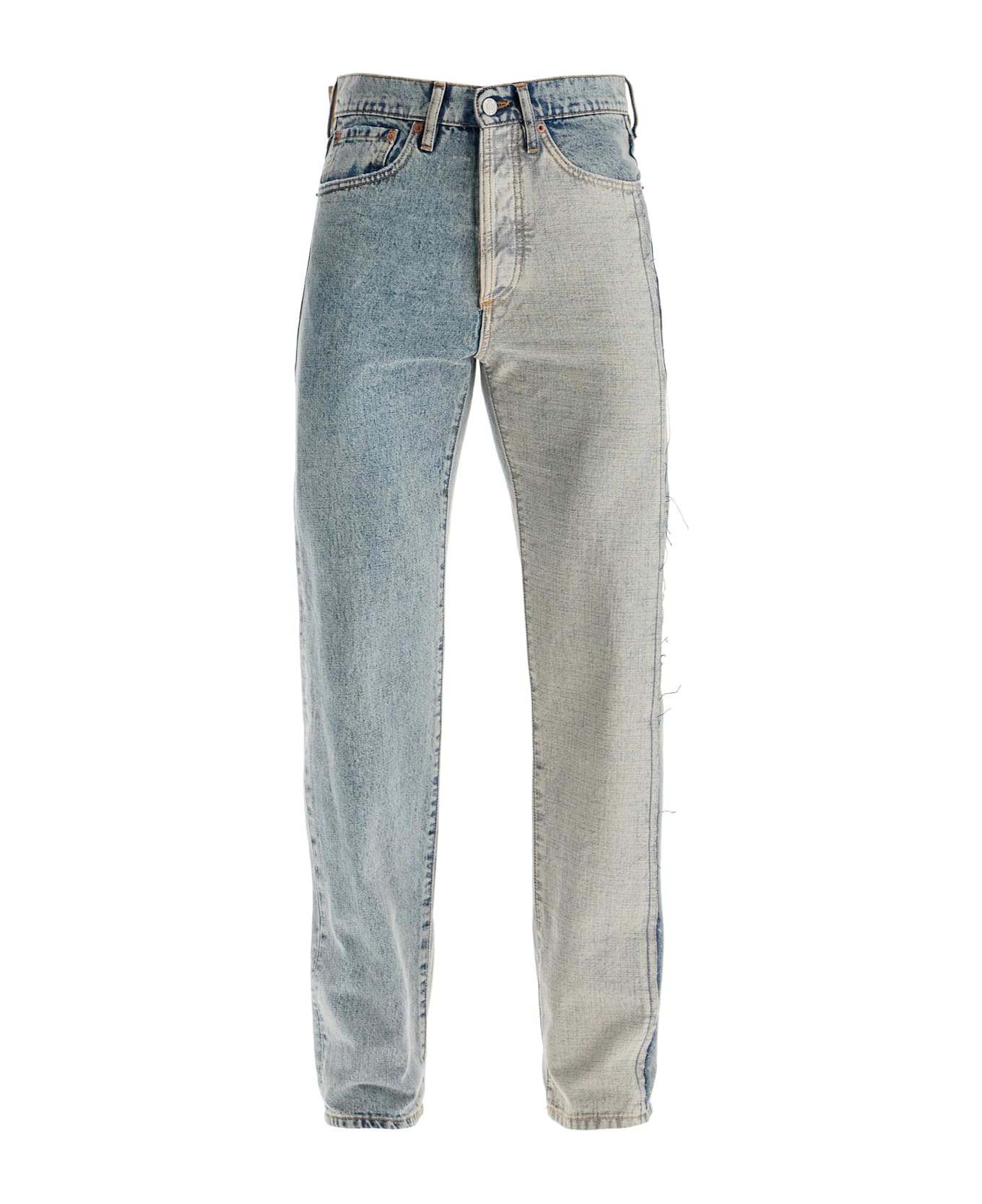 These MM6 Maison Margiela five-pocket jeans are made of indigo denim and feature a contrasting front panel. They have a button closure, a back jacron with a numeric logo, and a regular fit. The model is 182 cm tall and wears size 31. Composition: 100% CO