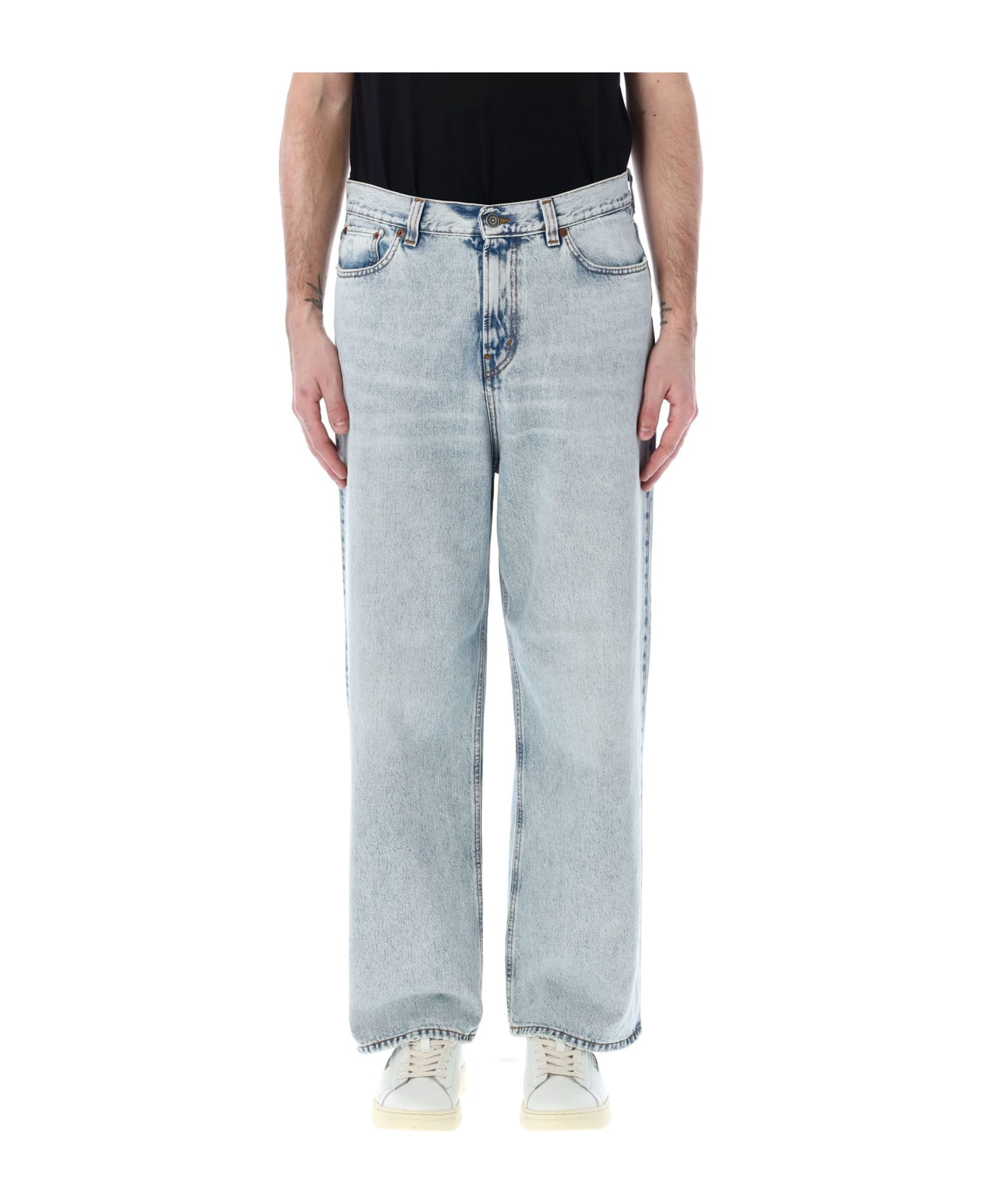 Jo Baggy Jeans By Haikure. Featuring: Washed Denim Regular Waist Button And Zip Closure Belt Loops Five Pockets Contrast Stitching Distressed Details Straight Leg Model Is 1,90 M And Wears Size 33