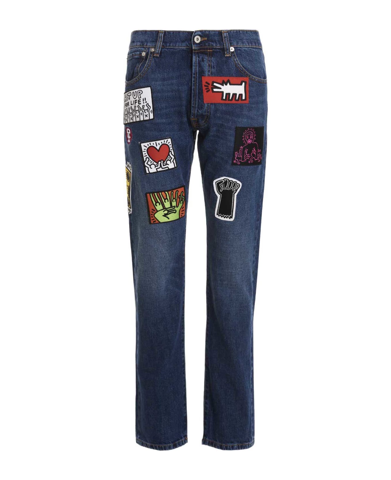 'Keith Haring' cotton denim jeans with button fly, all-over patches, contrast stitching, and five pockets.