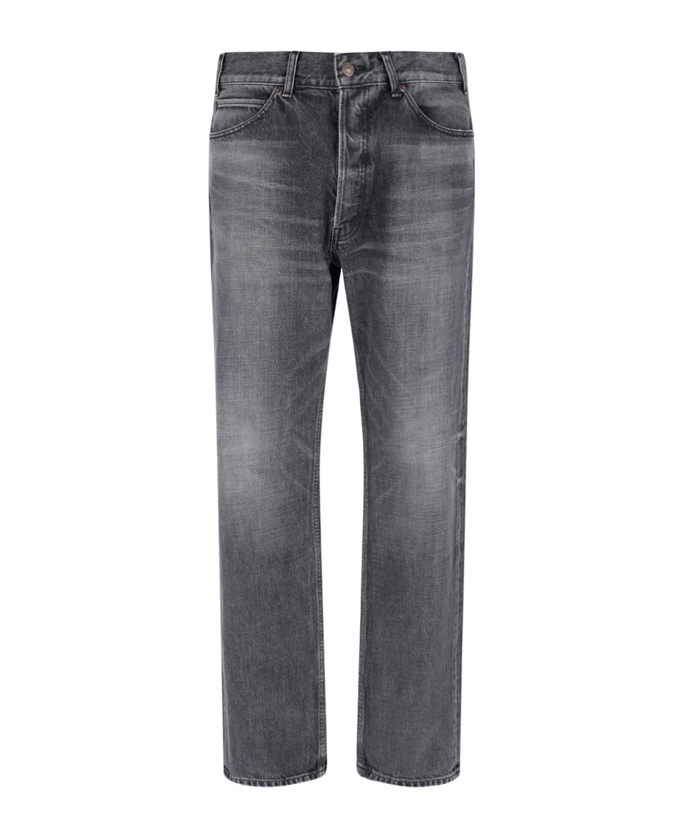 Celine straight "Kurt" jeans in black denim with usured wash, mid waist, belt loops, button closure, five pocket design, back logo patch, straight leg. Composition: 100% Cotton