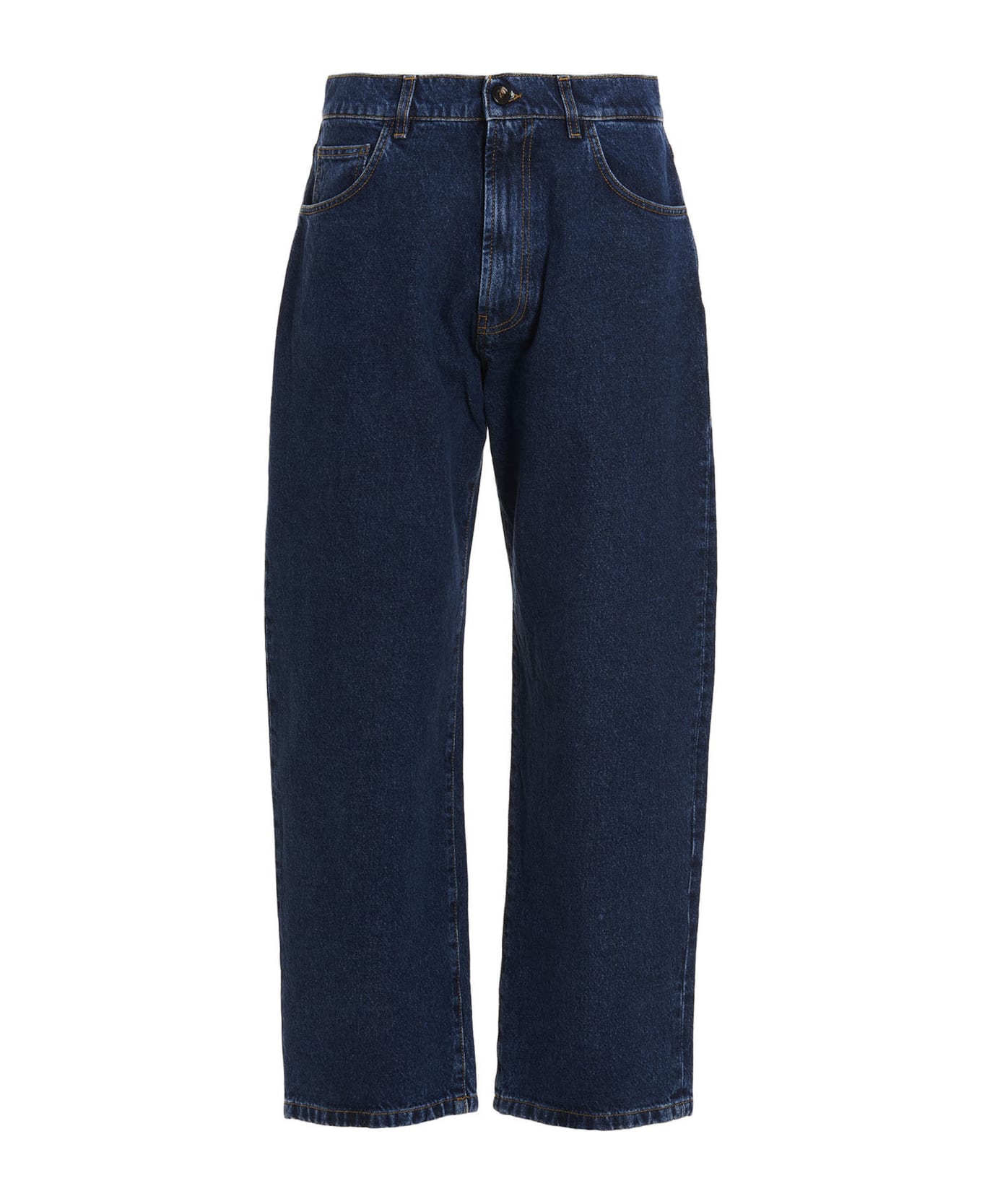 Cotton denim stone wash jeans with a rubberized logo plaque at the back, a zip and button closure, five pockets, and a loose leg.
