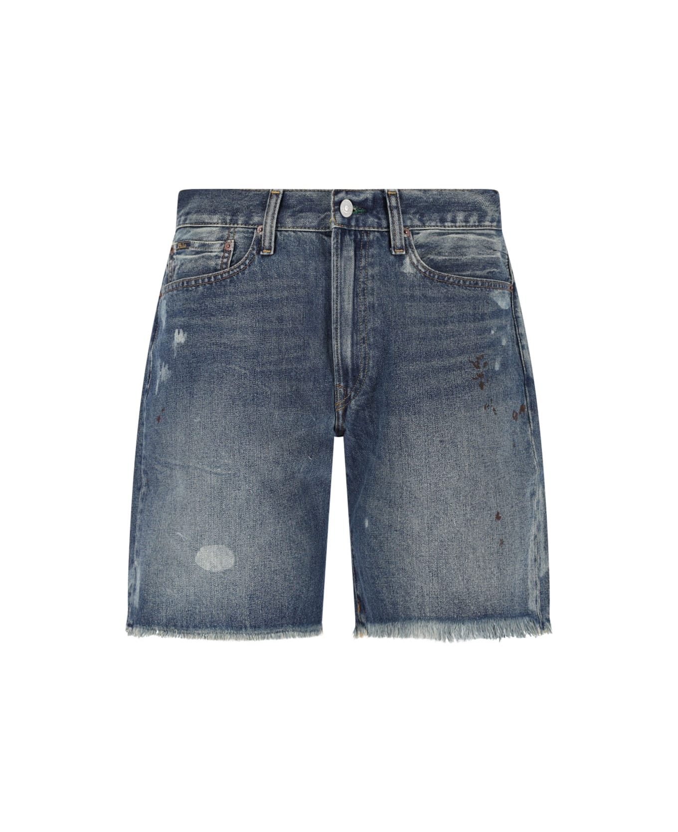 Polo Ralph Lauren blue logo denim shorts with usured wash, all-over destroyed details, mid waist, belt loops, button and zip closure, five pocket design, logo label detail, back logo patch, frayed details on the hem, straight leg.