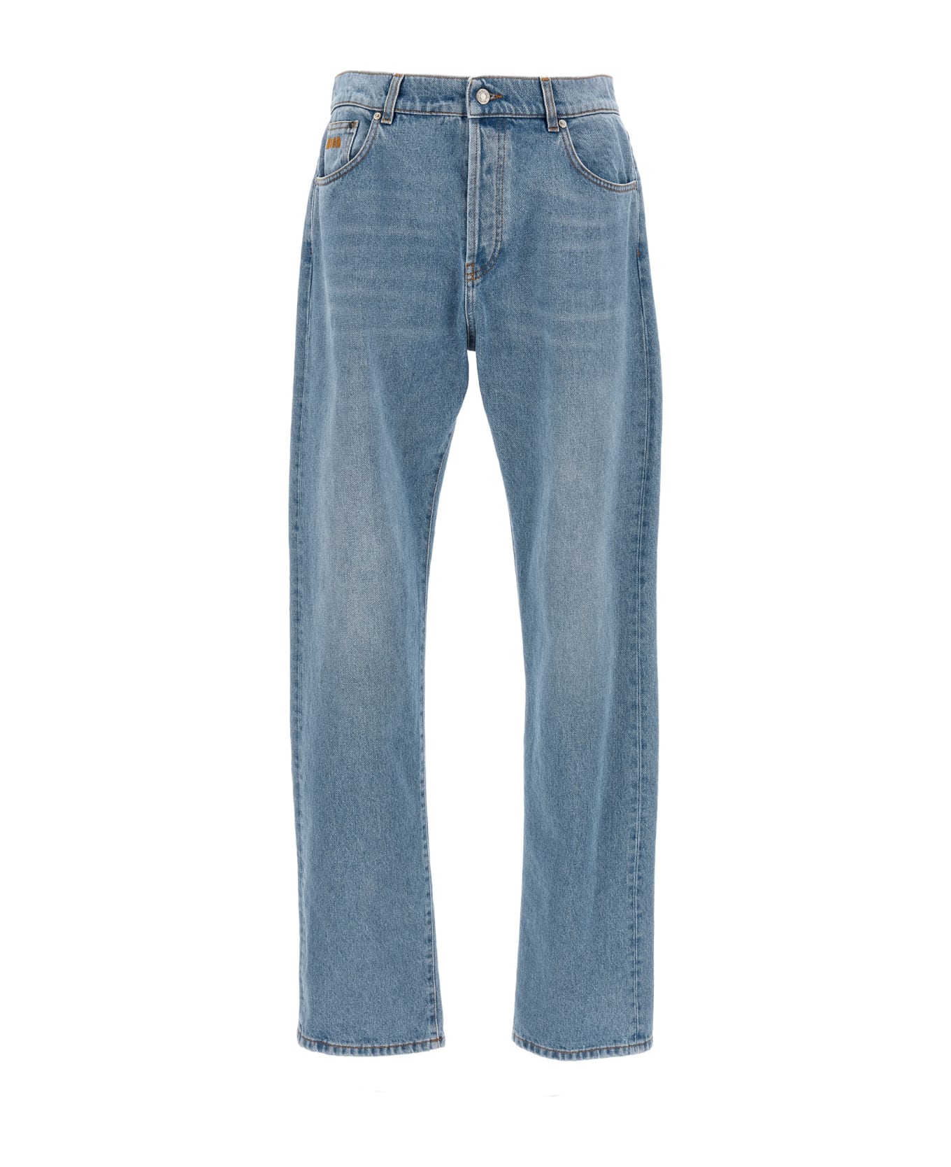 Cotton denim jeans with embroidered logo on the front and back, five pockets, button closure, and leather logo tag.