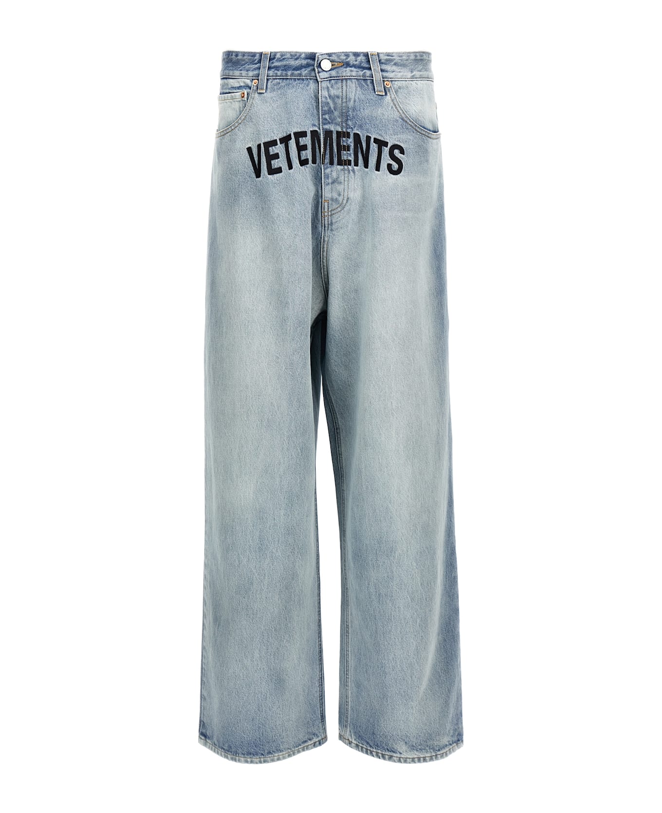 Vintage-effect cotton denim jeans, maxi logo embroidery on the front, button closure, five pockets, wide and straight leg, and leather logo label on the back.